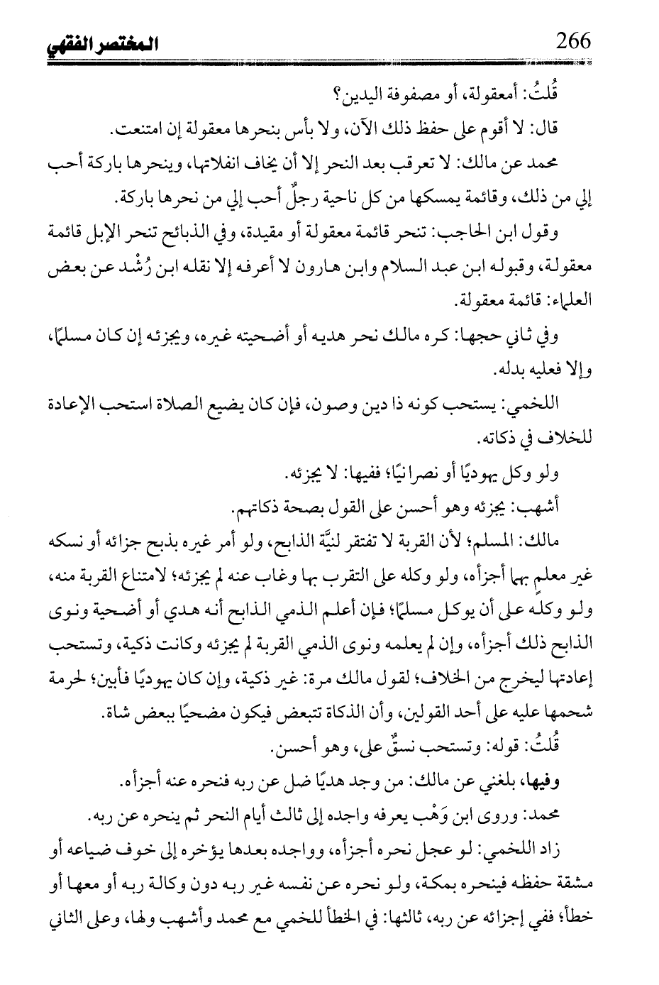 وقول ابن الحاجب: تنحر قائمة معقولة أو مقيدة، وفي الذبائح تنحر الإبل قائمة معقولة، وقبوله ابن عبد السلام وابن هارون لا أعرفه إلا نقله ابن رشد عن بعض العلماء: قائمة معقولة.