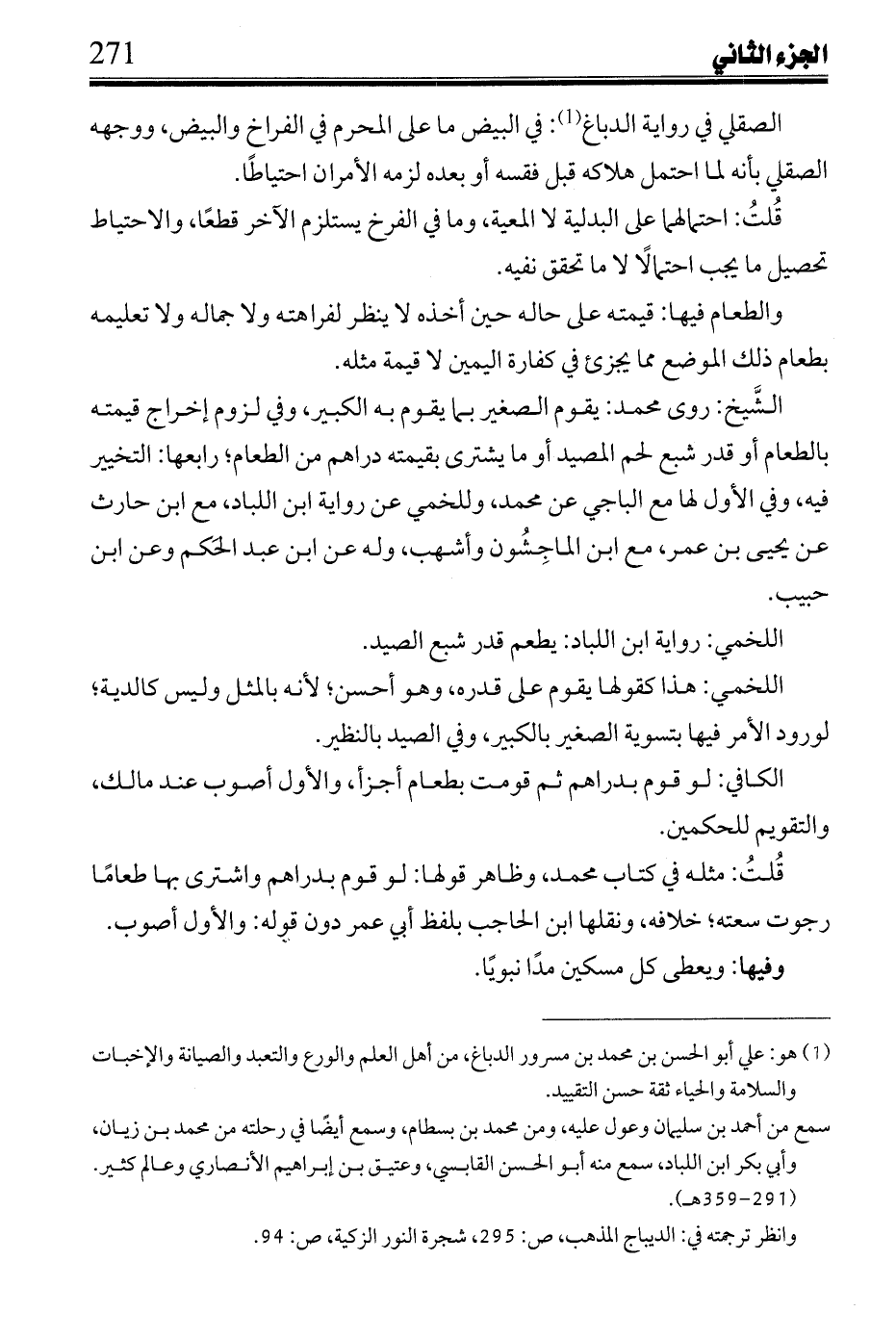 الشيخ: روى محمد: يقوم الصغير بما يقوم به الكبير، وفي لزوم إخراج قيمته بالطعام أو قدر شبع لحك المصيد أو ما يشترى بقيمته دراهم من الطعام؛ رابعها: التخيير فيه، وفي الأول لها مع الباجي عن محمد، وللخمي عن رواية ابن اللباد، مع ابن حارث عن يحيى بن عمر، مع ابن الماجشون وأشهب، وله عن ابن عبد الحكم وعن ابن حبيب.