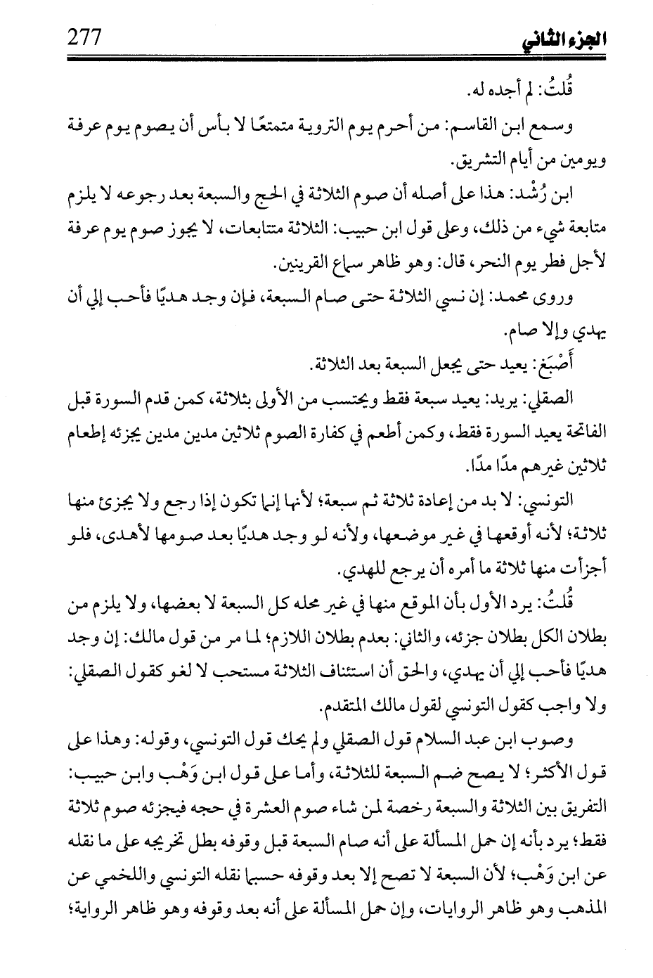 ابن رشد: هذا على أصله أن صوم الثلاثة في الحج والسبعة بعد رجوعه لا يلزم متابعة شيء من ذلك، وعلى قول ابن حبيب: الثلاثة متتابعات، لا يجوز صوم يوم عرفة لأجل فطر يوم النحر، قال: وهو ظاهر سماع القرينين.