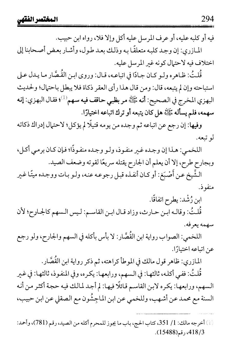 قلت: ظاهره ولو كان جادًا في إتباعه، قال: وروى ابن القصار ما يدل على استباحته وإن لم يتبعه، قال: ومن قال هذا رأى العقر ذكاة فلا يبطل باحتمال؛ ولحديث البهزي المخرج في الصحيح: أنه صلى الله عليه وسلم مر بظبي حاقف فيه سهم؛ فقال البهزي: إنه سهمه، فلم يسأله صلى الله عليه وسلم هل كان يتبعه أو ترك إتباعه اختيارًا.