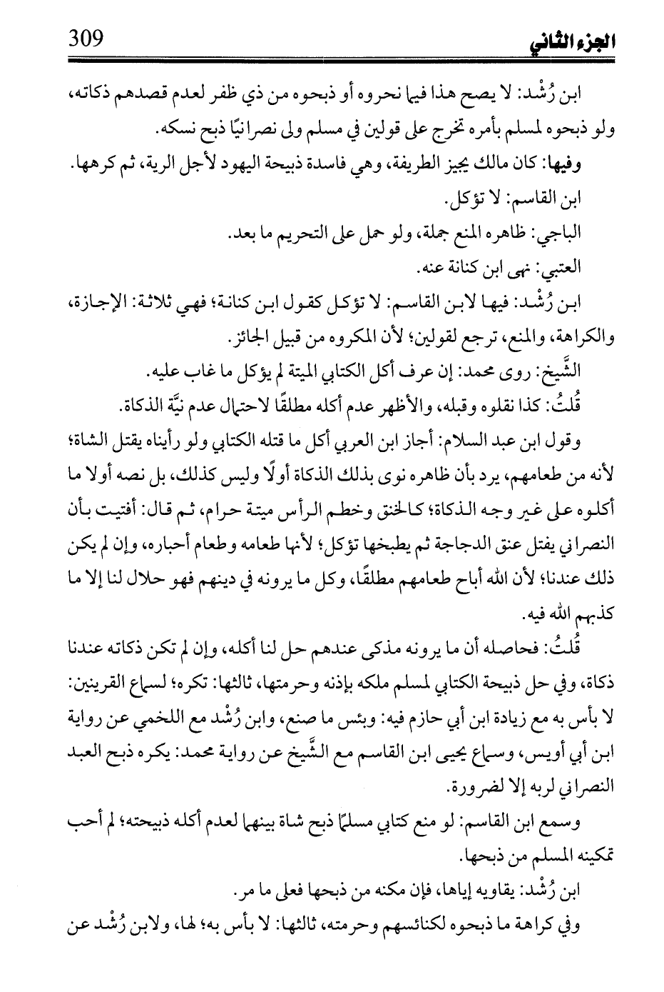 وقول ابن عبد السلام: أجاز ابن العربي أكل ما قتله الكتابي ولو رأيناه يقتل الشاة؛ لأنه من طعامهم, يرد بأن ظاهره نوى بذلك الذكاة أولًا وليس كذلك, بل نصه أولا ما أكلوه على غير وجه الذكاة؛ كالخنق وخطم الرأس ميتة حرام, ثم قال: أفتيت بأن النصراني يفتل عنق الدجاجة ثم يطبخها تؤكل؛ لأنها طعامه وطعام أحباره, وإن لم يكن ذلك عندنا؛ لأن الله أباح طعامهم مطلقًا, وكل ما يرونه في دينهم فهو حلال لنا إلا ما كذبهم الله فيه.