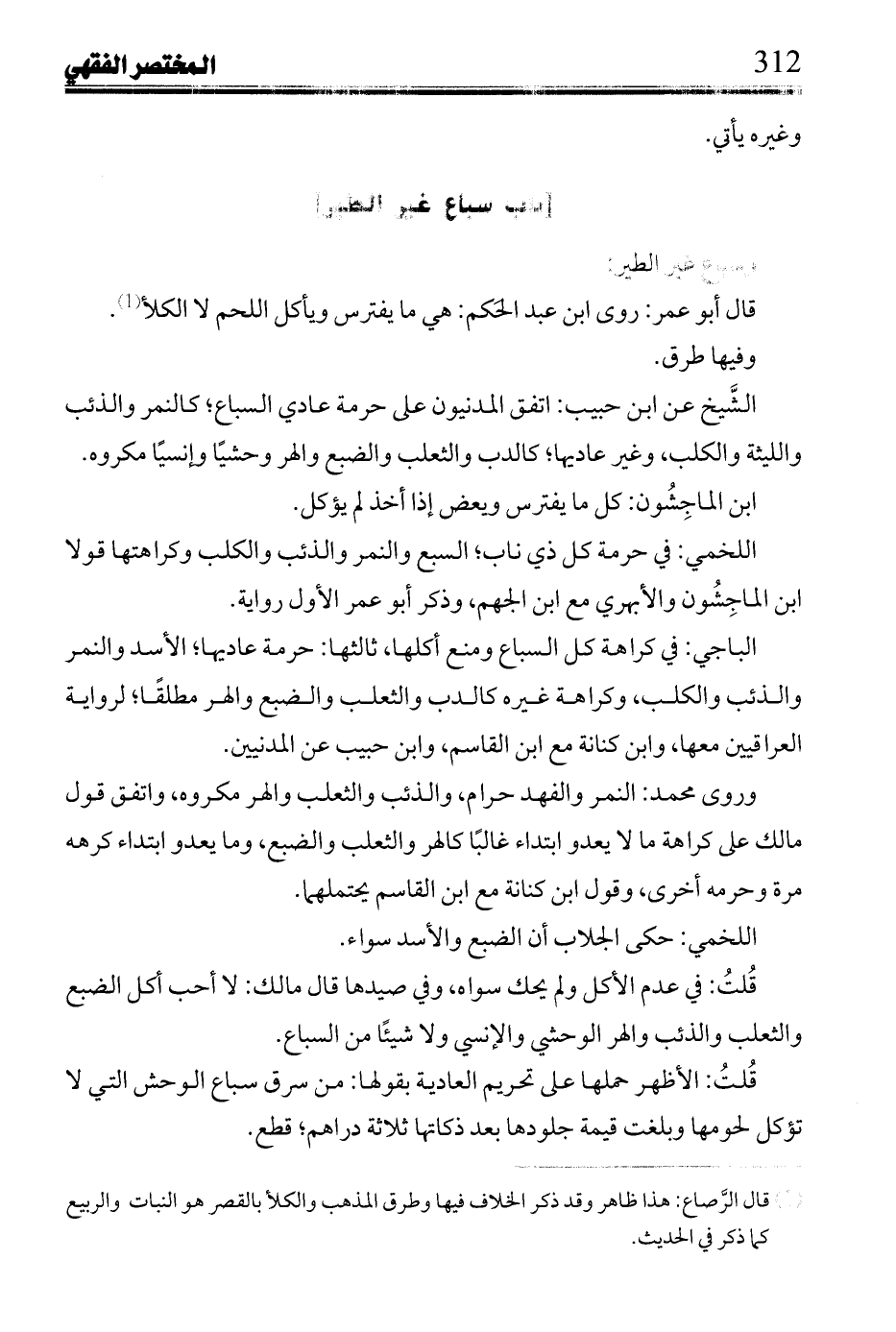 الباجي: في كراهة كل السباع ومنع أكلها, ثالثها: حرمة عاديها؛ الأسد والنمر والذئب والكلب, وكراهة غيره كالدب والثعلب والضبع والهر مطلقًا؛ لرواية العراقيين معها, وابن كنانة مع ابن القاسم, وابن حبيب عن المدنيين.