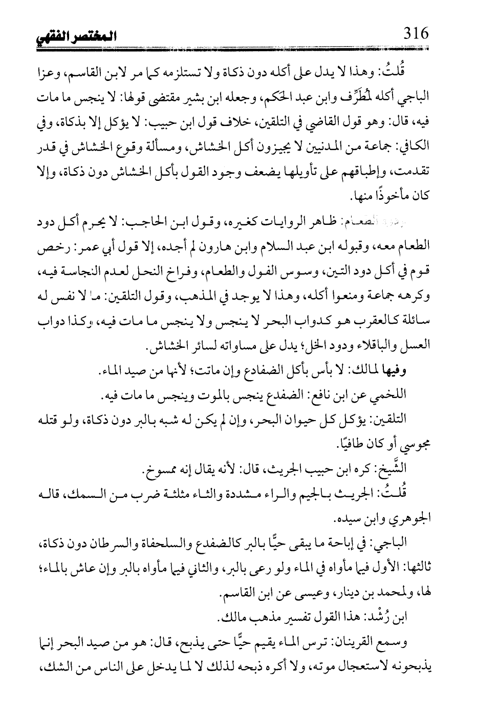 قلت: وهذا لا يدل على أكله دون ذكاة ولا تستلزمه كما مر لابن القاسم, وعزا الباجي أكله لمطرف وابن عبد الحكم, وجعله ابن بشير مقتضى قولها: لا ينجس ما مات فيه, قال: وهو قول القاضي في التلقين, خلاف قول ابن حبيب: لا يؤكل غلا بذكاة, وفي الكافي: جماعة من المدنيين لا يجيزون أكل الخشاش, ومسألة وقوع الخشاش في قدر تقدمت وإطباقهم على تأويلها يضعف وجود القول بأكل الخشاش دون ذكاة, وغلا كان مأخوذًا منها.