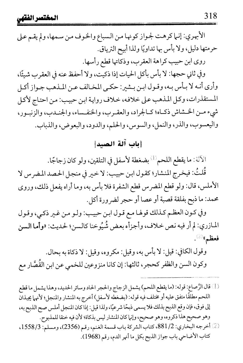 قلت: فيخرج المنشار؛ كقول ابن حبيب" لا خير في منجل الحصد المضرس لا الأملس, قال: ولو قطع المضرس قطع الشفرة فلا بأس به, وما أراه يفعل ذلك, وروى محمد: ما ذبح بفلقة قصبة أو عصا أو حجر لضرورة أكل.
