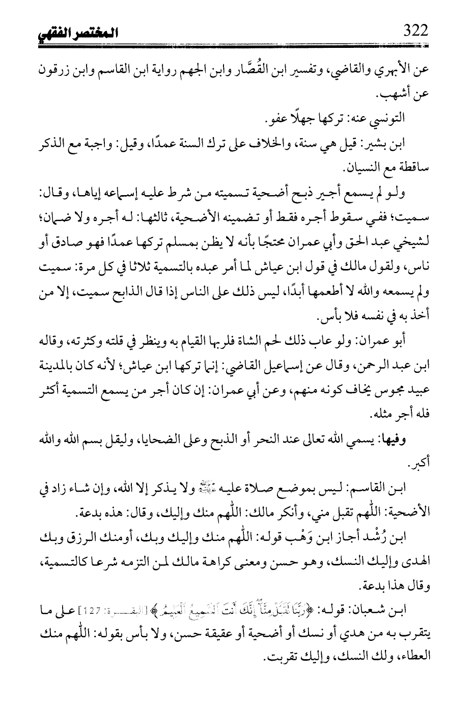 عن الأبهري والقاضي, وتفسير ابن القصار وابن الجهم رواية ابن القاسم وابن زرقون عن أشهب.