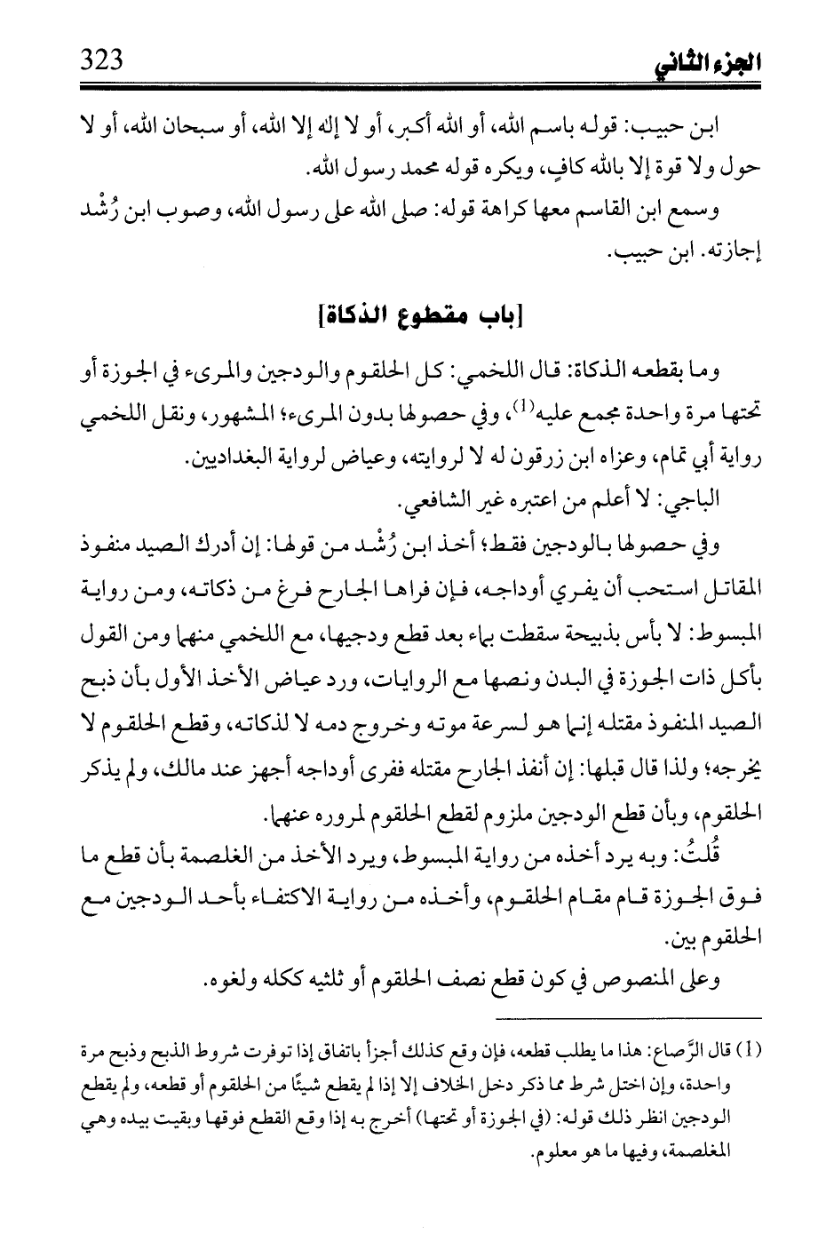 وما بقطعة الذكاة: قال اللخمي: كل الحلقوم والودجين والمرئ في الجوزة أتحتها مرة واحدة مجمع عليه, وفي حصولها بدون المرئ؛ المشهور, ونقل اللخمي رواية أبي تمام, وعزاه ابن زرقون له لا لروايته وعياض لرواية البغدادين.