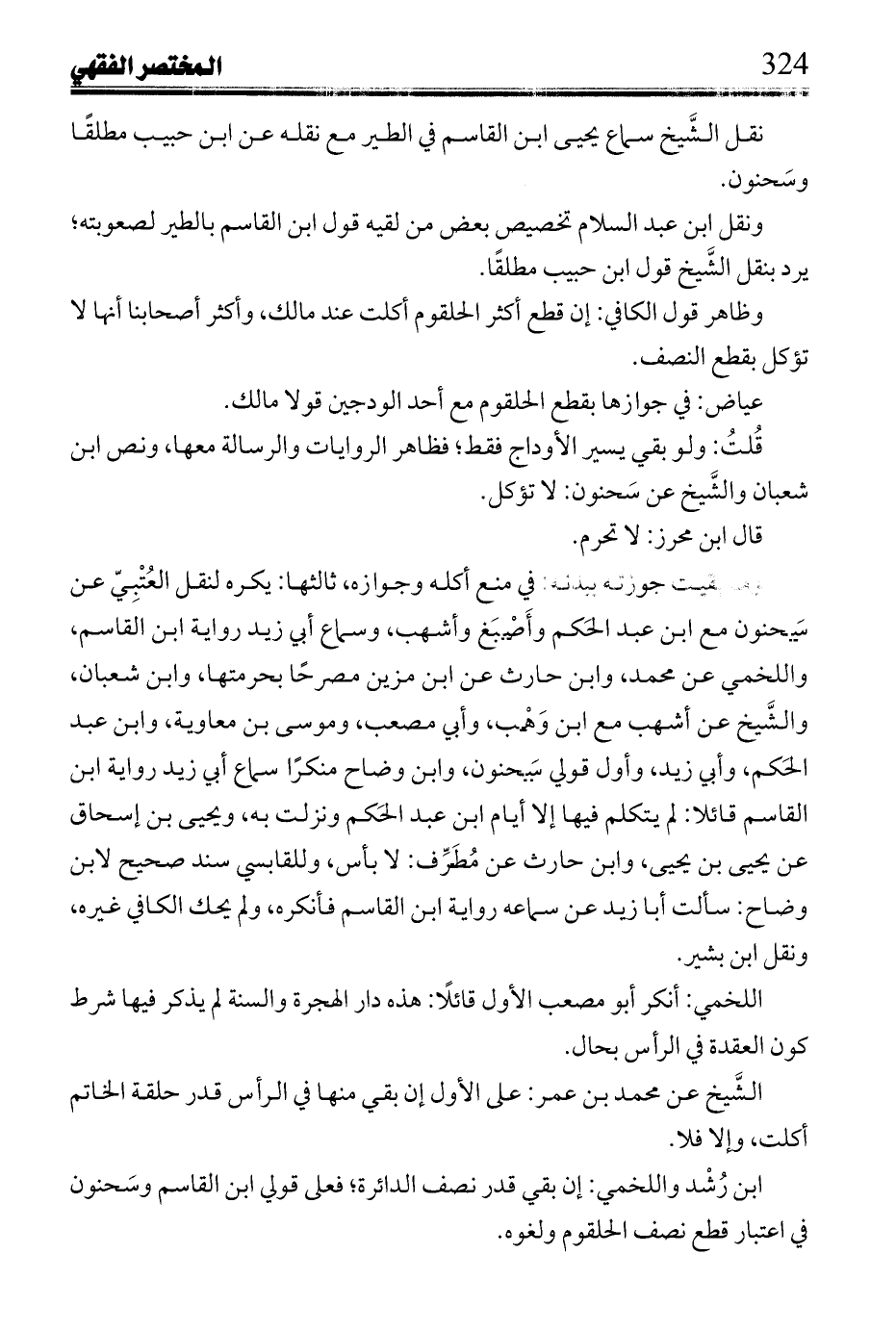 ($$) جوزته ببدنه في منع أكله وجوازه, ثالثها: يكره لنقل العتبي عن سحنون مع ابن عبد الحكم وأصبغ وأشهب, وسماع أبي زيد رواية ابن القاسم, واللخمي عن محمد, وابن حارث عن ابن مزين مصرحًا بحرمتها, وابن شعبان, والشيخ عن أشهب مع ابن وهب, وأبي مصعب, وموسى بن معاوية, وابن عبد الحكم, وأبي زيد, وأول قولي سحنون, وابن وضاح منكرًا سماع أبي زيد رواية ابن القاسم قائلا: لم يتكلم فيها إلا أيام ابن عبد الحكم ونزلت به, ويحيي بن إسحاق عن يحيي بن يحيي, وابن حارث عن مطرف: لا بأس, وللقابسي سند صحيح لابن وضاح: سألت أبا زيد عن سماعه رواية ابن القاسم فأنكره, ولم يحك الكافي غيره, ونقل ابن بشير.