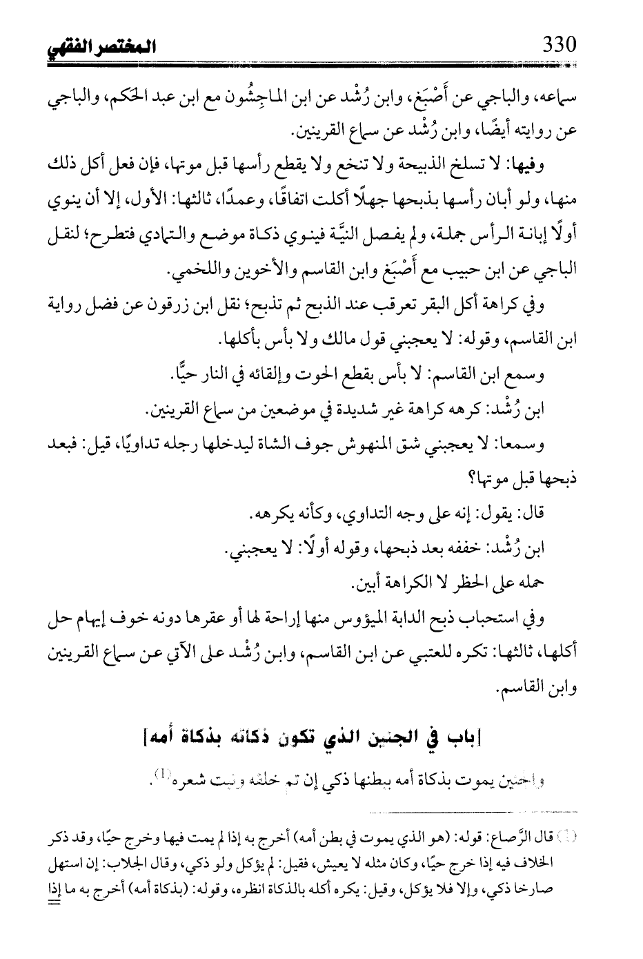 وفيها: لا تسلخ الذبيحة ولا تنخع ولا يقطع رأسها قبل موتها، فإن فعل أكل ذلك منها، ولو أبان رأسها بذبحها جهلًا أكلت اتفاقًا، وعمدًا، ثالثها: الأول، وإلا أن ينوي أولًا إبانة الرأس جملة، ولم يفصل النية فينوي ذكاه موضع والتمادي فتطرح؛ لنقل الباجي عن ابن حبيب مع أصبغ وابن القاسم والأخوين واللخمي.