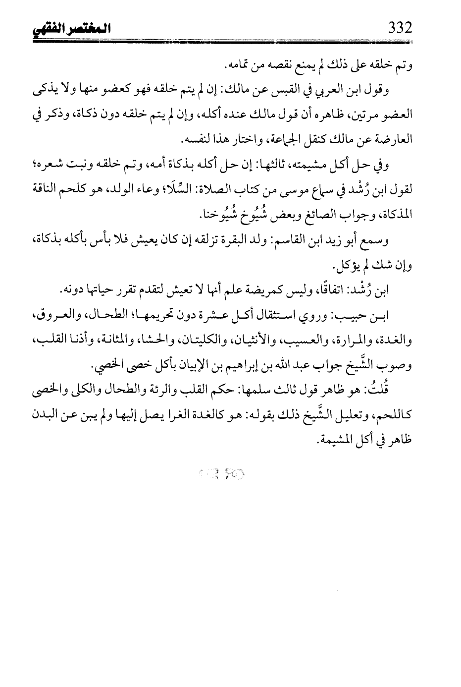 وقول ابن العربي في القبس عن مالك: إن لم يتم خلقه فهو كعضو منها ولا يذكى العضو مرتين، ظاهره أن قول مالك عنده أكله، وإن لم يتم خلقه دون ذكاه، وذكر في العارضة عن مالك كنقل الجماعة، واختار هذا لنفسه.