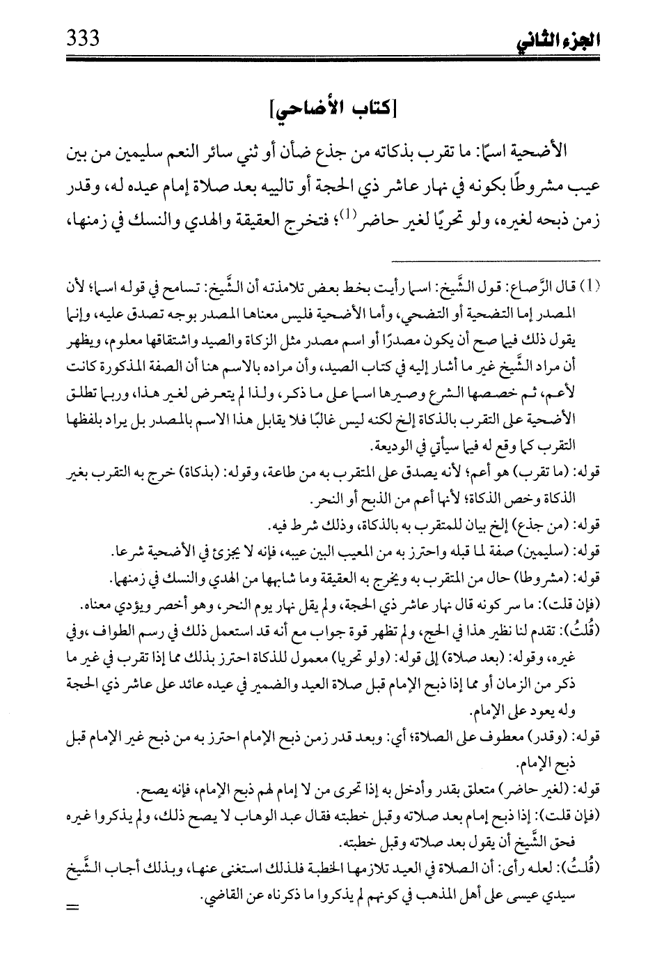 الأضحية اسمًا: ما تقرب بذكاته من جذع ضأن أو ثني سائر النعم سليمين من بين عيب مشروطًا بكونه في نهار عاشر ذي الحجة أو تالييه بعد صلاة إمام عيده له، وقدر زمن ذبحه لغيره، ولو تحريًا لغير حاضر؛ فتخرج العقيقة والهدي والنسك في زمنها،