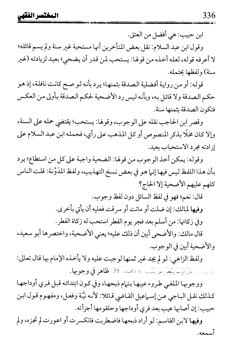 وقوله: يمكن أخذ الوجوب من قولها: الضحية واجبة على كل من استطاع؛ يرد بأن هذا اللفظ ليس فيها إنما هو في بعض نسخ التعذيب، ولفظ المدونة: قلت الناس كلهم عليهم الأضحية إلا الحاج؟