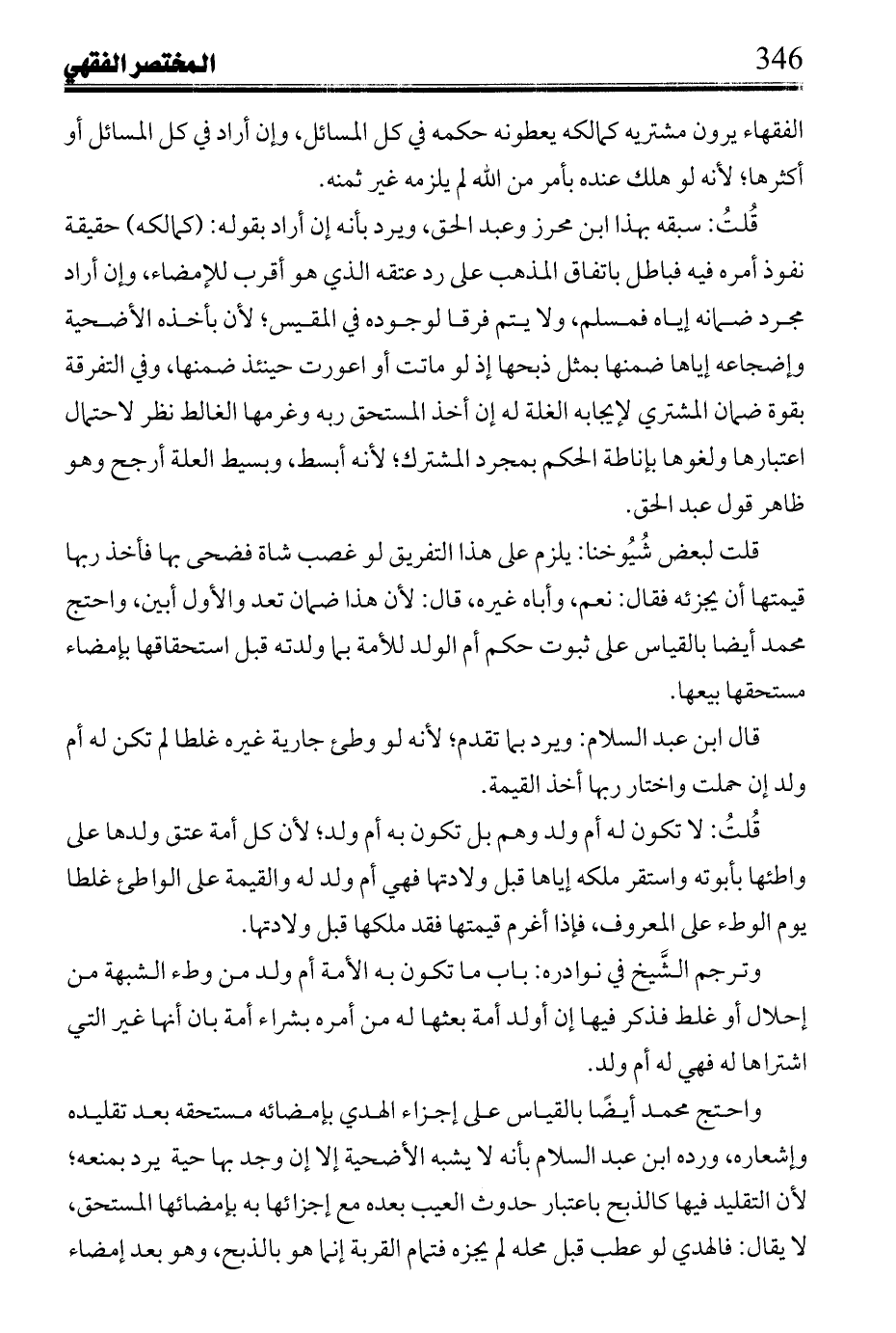 قلت: سبقه بهذا ابن محرز وعبد الحق، ويرد بأنه إن أراد بقوله: (كمالكه) حقيقة نفوذ أمره فيه فباطل باتفاق المذهب على رد عتقه الذي هو أقرب للإمضاء، وإن أراد مجرد ضمانه إياه فمسلم، ولا يتم فرقا لوجوده في المقيس؛ لأن بأخذه الأضحية وإضجاعه إياها ضمنها بمثل ذبحها إذ لو ماتت أو اعورت حينئذ ضمنها، وفي التفرقة بقوة ضمان المشتري لإيجابه الغله له إن أخذ المستحق ربه وغرمها الغالط نظر لاحتمال اعتبارها ولغوها بإناطة الحكم بمجرد المشترك؛ لأنه أبسط، وبسيط العلة أرجح وهو ظاهر قول عبد الحق.