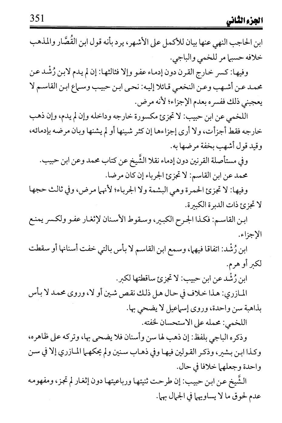 وفيها: كسر خارج القرن دون إدماء عفو وإلا فثالثها: إن لم يدم لابن رشد عن محمد عن أشهب وعن النخعي قائلاً إليه: نحى ابن حبيب وسماع ابن القاسم لا يعجبني ذلك ففسره بعدم الإجزاء؛ لأنه مرض.