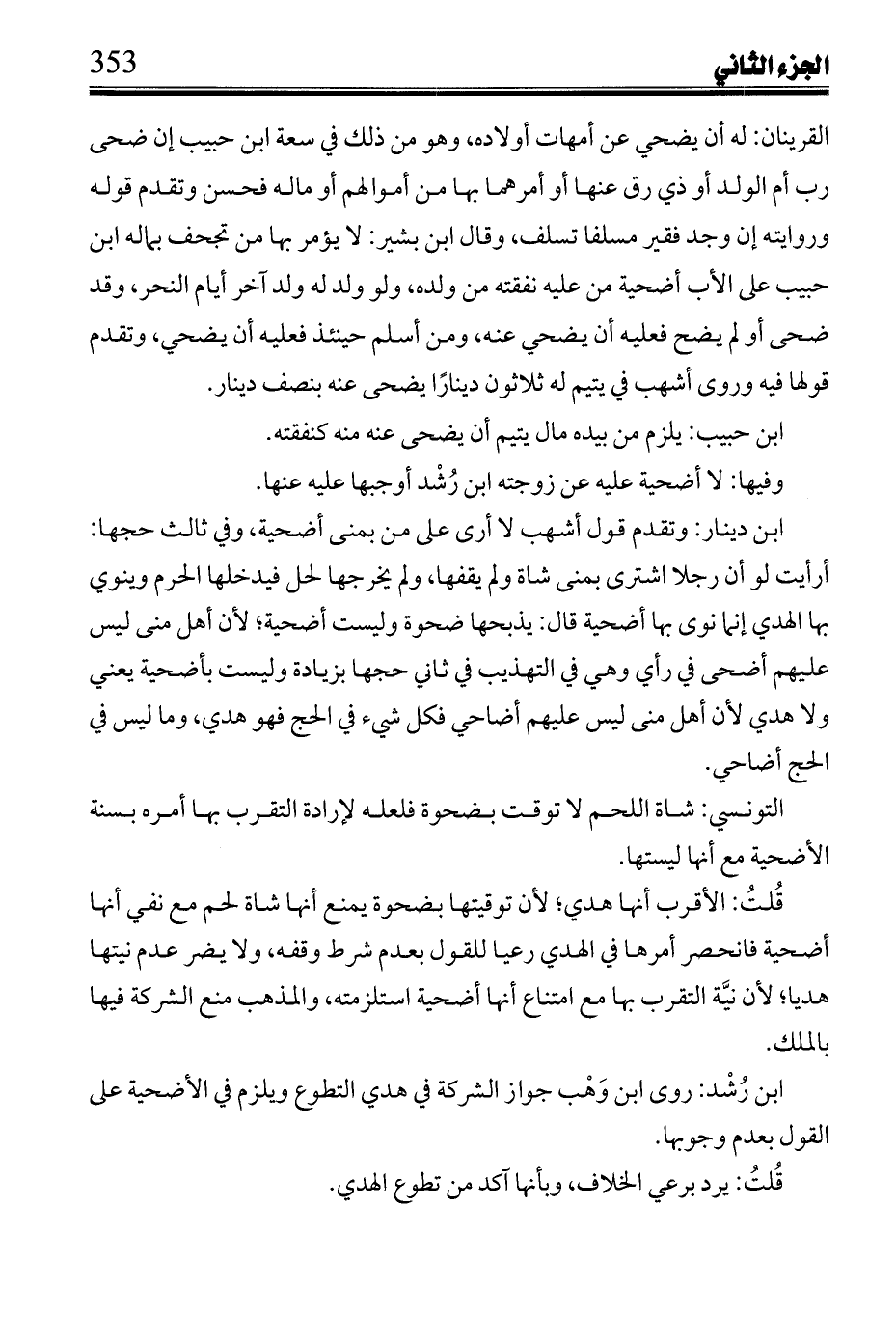ابن رشد: روي ابن وهب جواز الشركة في هدي التطوع ويلزم في الأضحية على القول بعدم وجوبها.