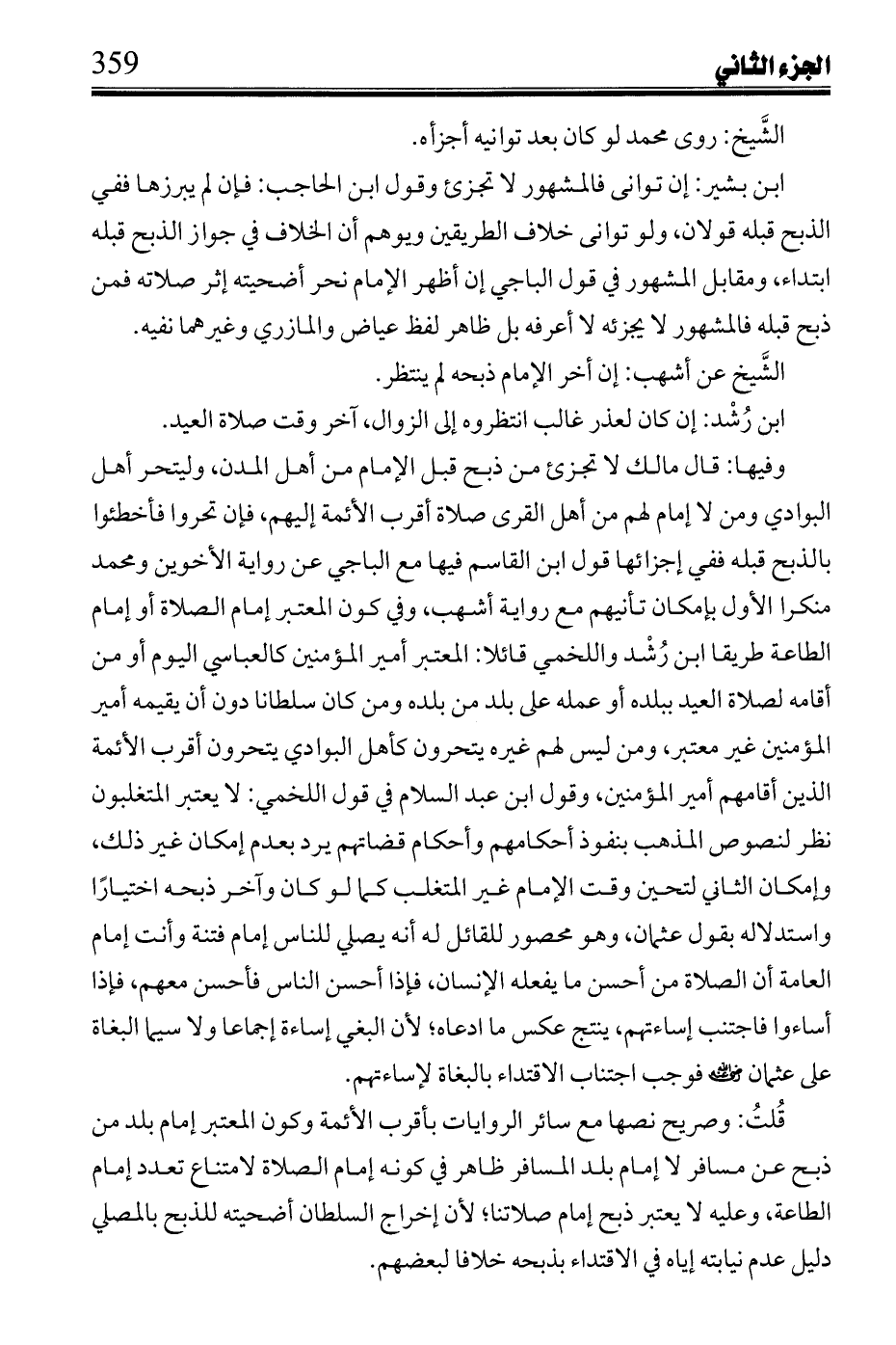 وفيها: قال مالك لا تجزئ من ذبح قبل الإمام من أهل المدن، ويتحر أهل البوادي ومن لا إمام لهم من أهل القرى صلاة أقرب الأئمة إليهم، فإن تحروا فأخطئوا بالذبح قبله ففي إجزائها قول ابن القاسم فيها مع الباجي عن رواية الأخوين ومحمد منكرا الأول بإمكان تأنيهم مع رواية أشهب، وفي كون المعتبر إمام الصلاة أو إمام الطاعة طريقا ابن رشد واللخمي قائلا: المعتبر أمير المؤمنين كالعباسي اليوم أو من أقامة لصلاة العيد ببلده أو عمله على بلد من بلده ومن كان سلطانا دون أن يقيمه أمير المؤمنين غير معتبر، ومن ليس لهم غيره يتحرون كأهل البوادي يتحرون أقرب الأئمة الذين أقامهم أمير المؤمنين، وقول ابن عبد السلام في قول اللخمي: لا يعتبر المتغلبون نظر لنصوص المذهب بنفوذ أحكامهم وأحكام قضاتهم يرد بعدم إمكان غير ذلك، وإمكان الثاني لتحين وقت الإمام غير المتغلب كما لو كان وآخر ذبحه أختياراً واستدلاله بقول عثمان، وهو محصور للقائل له أنه يصلي للناس إمام فتنة وأنت إمام العامة أن الصلاة من أحسن ما يفعله الإنسان، فإذا أحسن الناس فأحسن معهم، فإذا أساءوا فاجتنب إساءتهم، ينتج عكس ما ادعاه؛ لأن البغي إساءة إجماعا ولا سيما البغاة على عثمان رضي الله عنه فوجب اجتناب الاقتداء بالبغاة لإساءتهم.