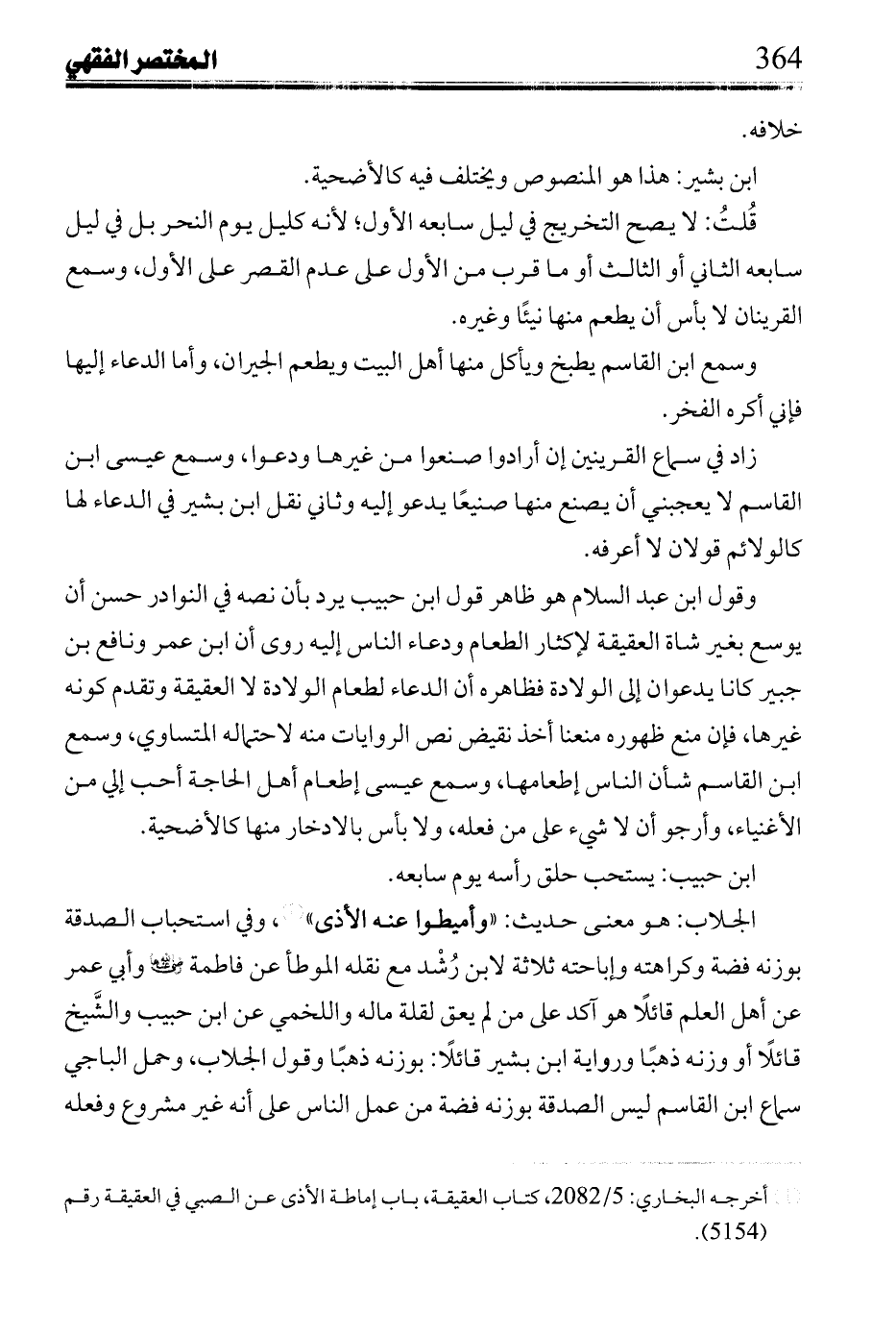 الجلاب: هو معني حديث: ((وأميطوا عنه الأذي))، وفي استحباب الصدقة بوزنه فضة وكراهته وإباحته ثلاثة لابن رشد مع نقله الموطأ عن فاطمة رضي الله عنها وأبي عمر عن أهل العلم قائلاً هو آكد على من لم يعق لقلة ماله واللخمي عن ابن حبيب والشيخ قائلاً أو وزنه ذهباً ورواية ابن بشير قائلاً: بوزنه ذهباً وقول الجلاب، وحمل الباجي سماع ابن القاسم ليس الصدقة بوزنه فضة من عمل الناس على أنه غير مشروع وفعله