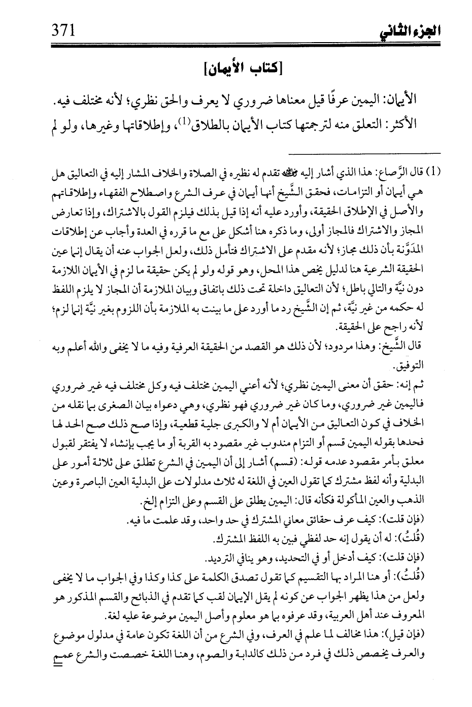 الأيمان: اليمين عرفاً قيل معناها ضروري لا يعرف والحق نظري؛ لأنه مختلف فيه.