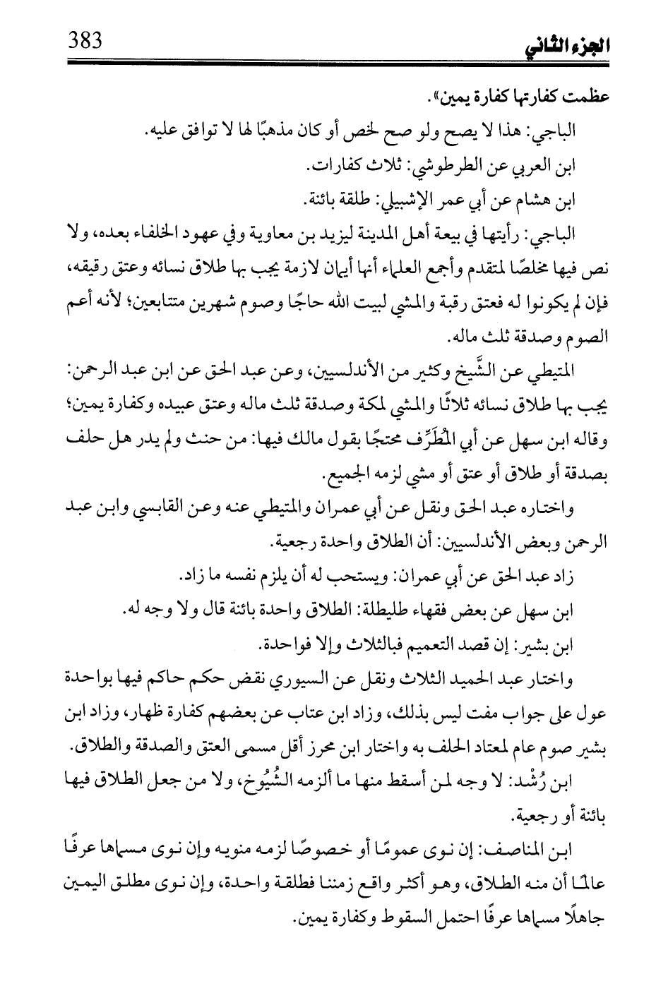 واختار عبد الحميد الثلاث ونقل عن السيوري نقض حكم حاكم فيها بواحدة عول على جواب مفت ليس بذلك، وزاد ابن عتاب عن بعضهم كفارة ظهار، وزاد ابن بشير صوم عام لمعتاد الحلف به واختار ابن محرز أقل مسمى العتق والصدقة والطلاق.