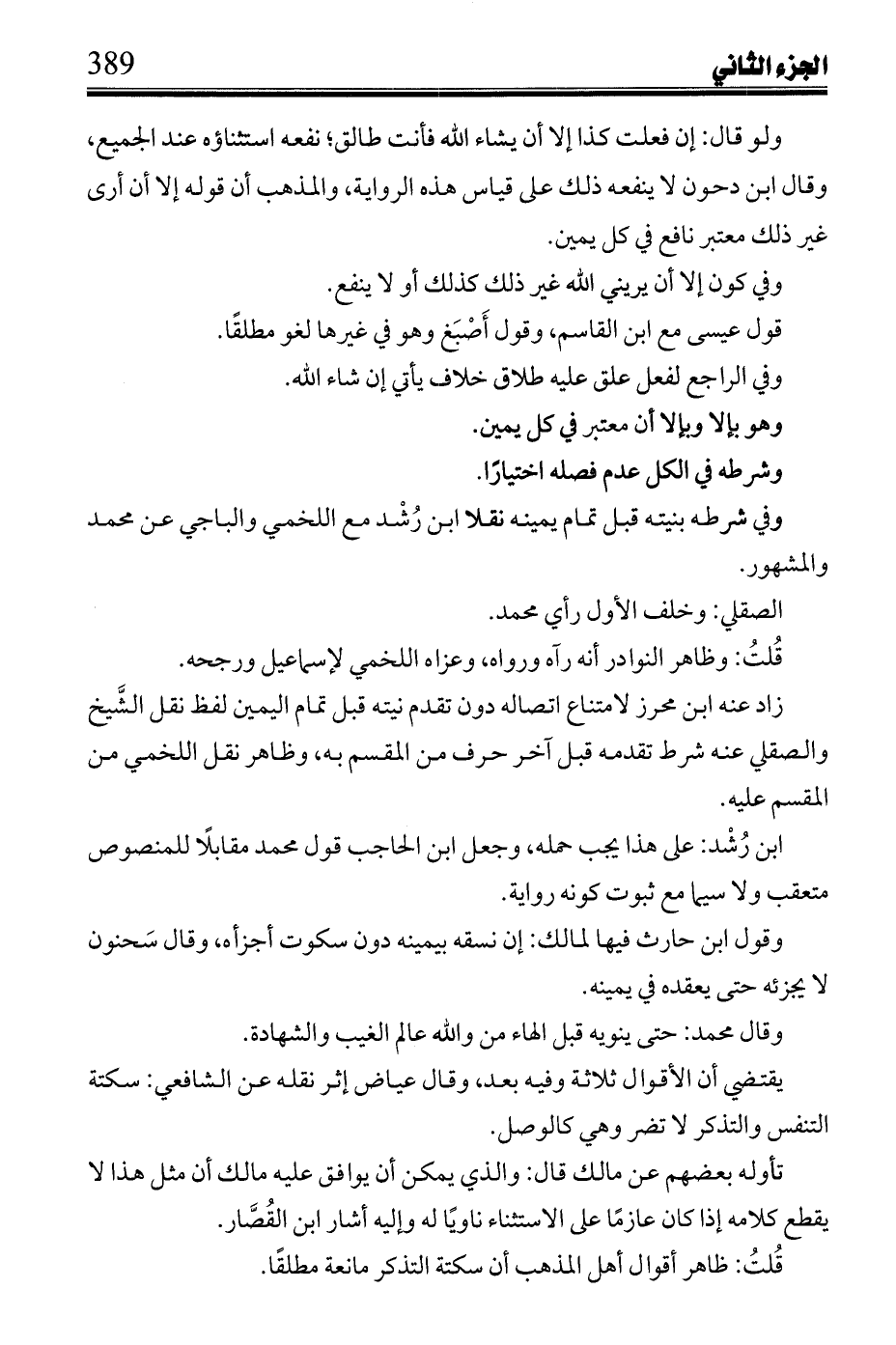 زاد عنه ابن محرز لامتناع اتصاله دون تقدم نيته قبل تمام اليمين لفظ نقل الشيخ والصقلي عنه شرط تقدمه قبل آخر حرف من المقسم به، وظاهر نقل اللخمي من المقسم عليه.