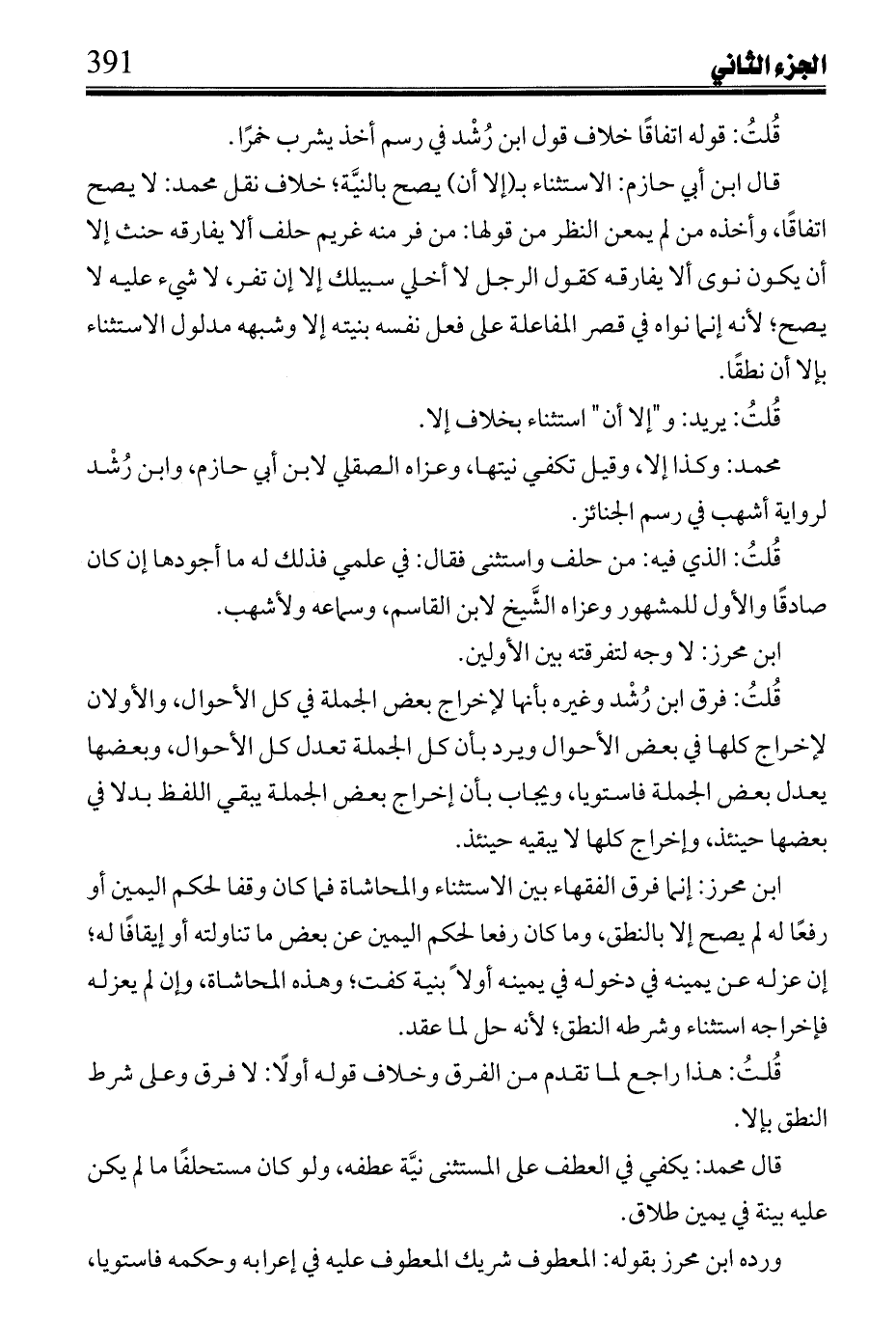 ابن محرز: إنما فرق الفقهاء بين الاستثناء والمحاشاة فما كان وقفًا لحكم اليمين أو رفعًا له لم يصح إلا بالنطق، وما كان رفعًا له لم يصح إلا بالنطق، وما كان رفعًا لحكم اليمين عن بعض ما تناولته أو إيقافًا له؛ إن عزله عن يمينه في دخوله في يمينه أولًا بنية كفت؛ وهذه المحاشاة، وإن لم يعزله فإخراجه استثناء وشرطه النطق؛ لأنه حل لما عقد.