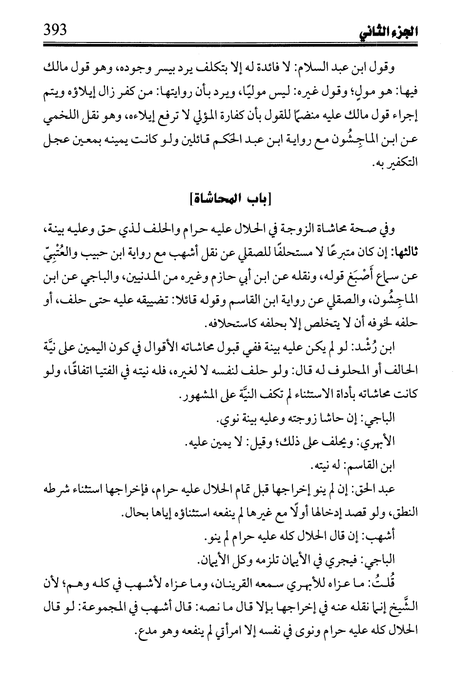 وفي صحة محاشاة الزوجة في الحلال عليه حرام والحلف لذي حق وعليه بينة، ثالثها: إن كان متبرعًا لا مستحلفًا للصقلي عن نقل أشهب مع رواية ابن حبيب والعتبي عن سماع أصبغ قوله، ونقله عن ابن أبي حازم وغيره من المدنيين، والباجي عن ابن الماجشون، والصقلي عن رواية ابن القاسم وقوله قائلا: تضييقه عليه حتى حلف، أو حلفه لخوفه أن لا يتخلص إلا بحلفه كاستحلافه.