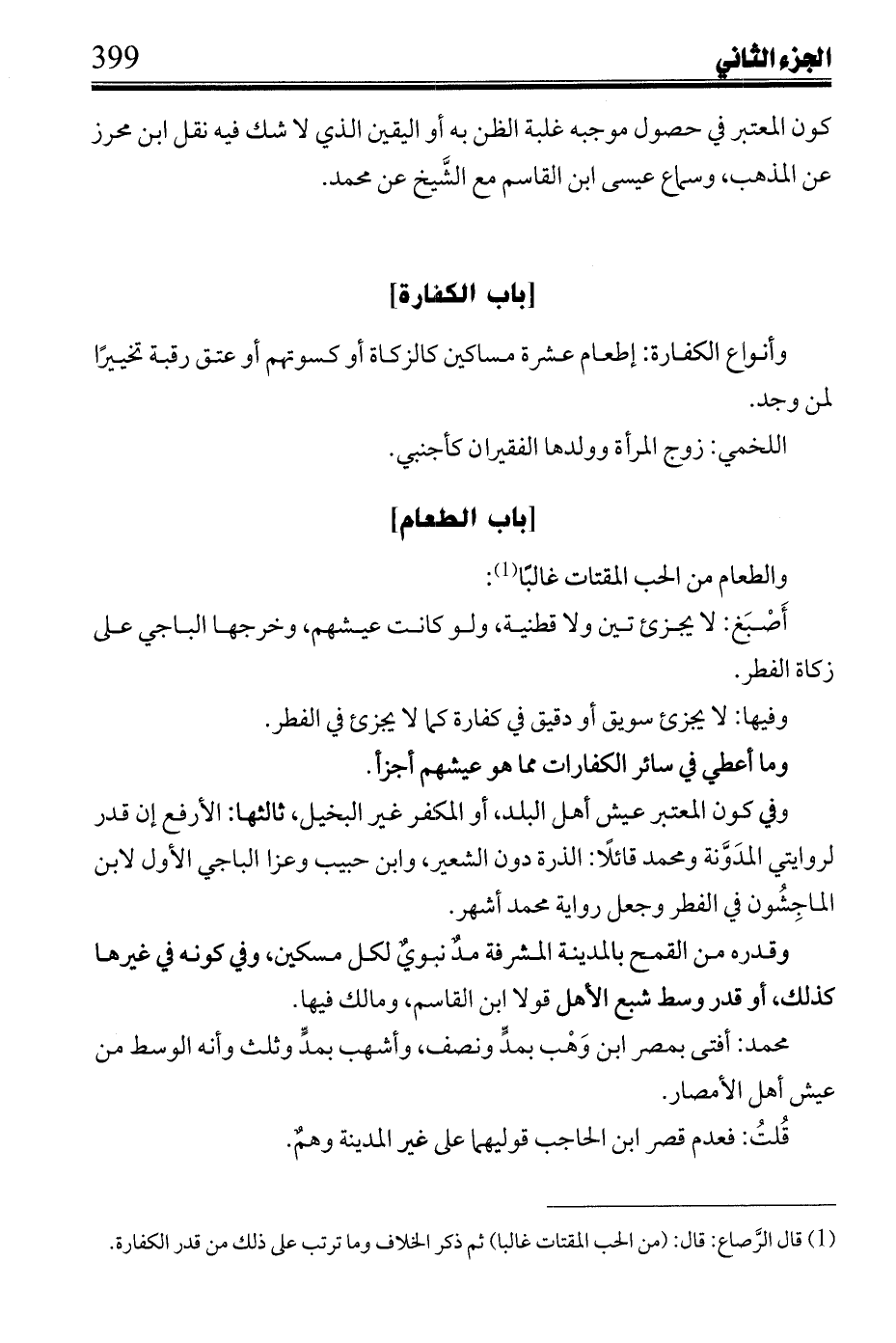 وفي كون المعتبر عيش أهل البلد، أو المكفر غير البخيل، ثالثها: الأرفع إن قدر لروايتي المدونة ومحمد قائلاً: الذرة دون الشعير: وابن حبيب وعزا الباجي الأول لابن الماجشون في الفطر وجعل رواية محمد أشهر.