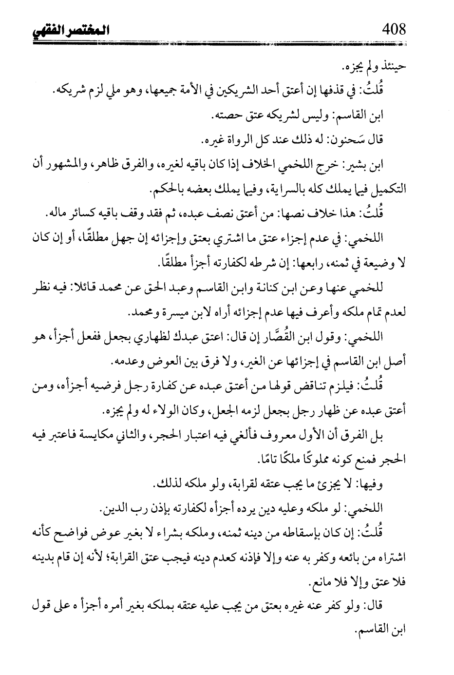 اللخمي عنها وعن أبن كنانة وأبن القاسم وعبد الحق عن محمد قائلاً: فيه نظر لعدم تمام ملكه وأعرف فيها عدم إجزائه أراه لأبن ميسرة ومحمد.