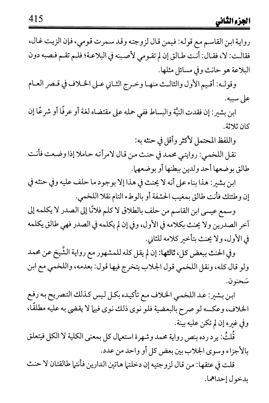 وفي الحنث ببعض كل، ثالثها: إن لم يقل كله للمشهور مع رواية الشيخ عن محمد ولو قال كله، ونقل اللخمي قول الجلاب يتخرج فيها قول: بعدمه، واللخمي مع أبن سحنون.