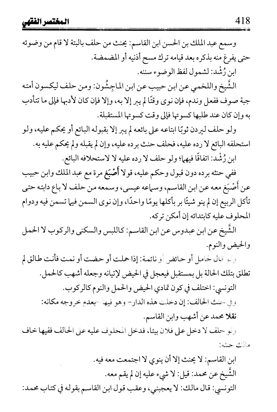 ففى حنثه برده دون قبول وحكم عليه، قولا أصبغ مرة مع عبد الملك وأبن حبيب عن أصبغ معه عن أبن القاسم، وسماعه عيسى، وسمعه من حلف لا باع دابته حتى تأكل الربيع إن لم ينو شيئًا بر بأكلها يومًا واحدًا، وإن نوى السمن فيما تسمن فيه ودوام المحلوف عليه كابتدائه إن أمكن تركه.