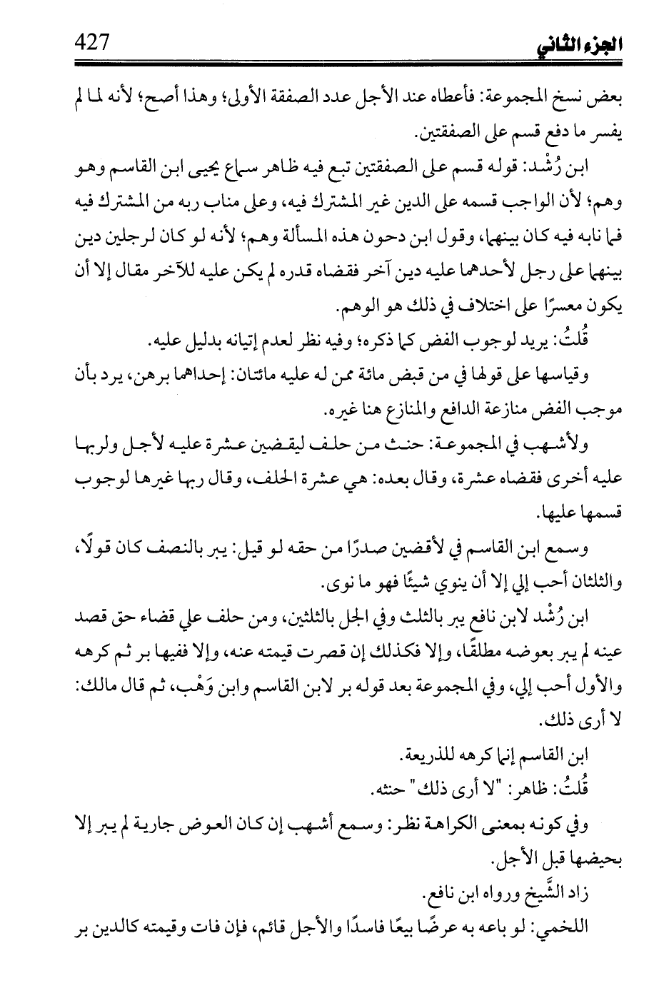 ابن رشد: قوله قسم على الصفقتين تبع فيه ظاهر سماع يحيى ابن القاسم وهو وهم؛ لأن الواجب قسمه على الدين غير المشترك، وعلى مناب ربه من المشترك فيه فما نابه فيه كان بينهما، وقول ابن دحون هذه المسألة وهم؛ لأنه لو كان لرجلين دين بينهما على رجل لأحدهما عليه دين آخر فقضاه قدره لم يكن عليه للآخر مقال إلا أن يكون معسرًا على اختلاف في ذلك هو الوهم.