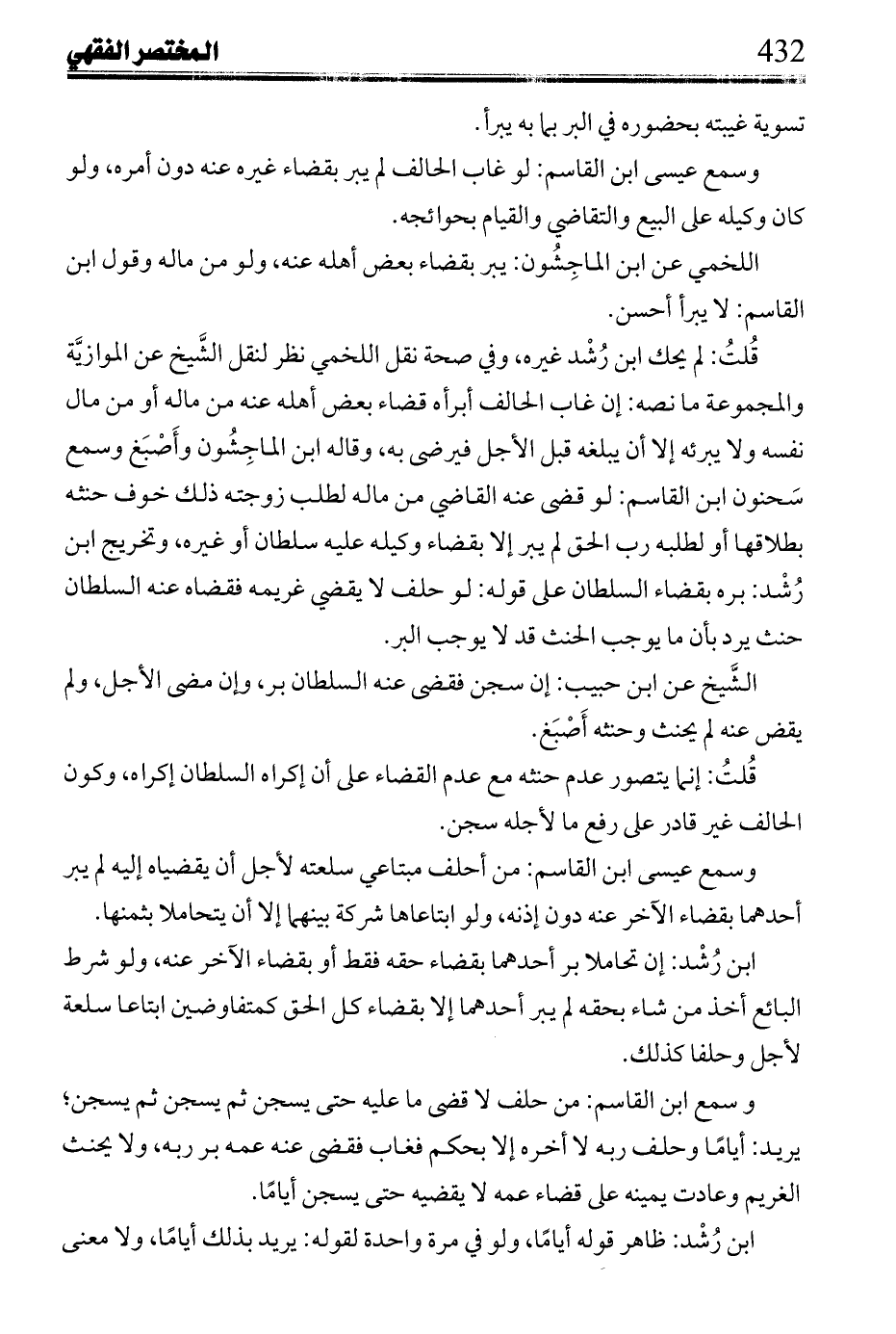 وسمع ابن القاسم: من حلف لا قضي م عليه حتى يسجن ثم يسجن؛ يريد: أياماً وحلف ربه لا آخره إلا بحكم فغاب فقضي عنه عمه بر ربه، ولا يحنث الغريم وعادت يمينه علي قضاء عمه لا يقضيه حتى يسجن أياماً