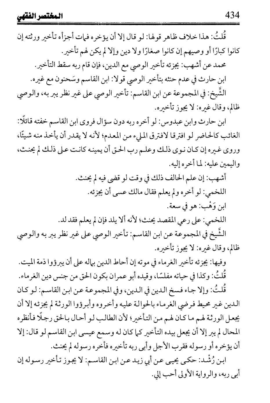 ابن حارث في عدم حنثه بتأخير الوصي قولا: ابن القاسم وسحنون مع غيره.