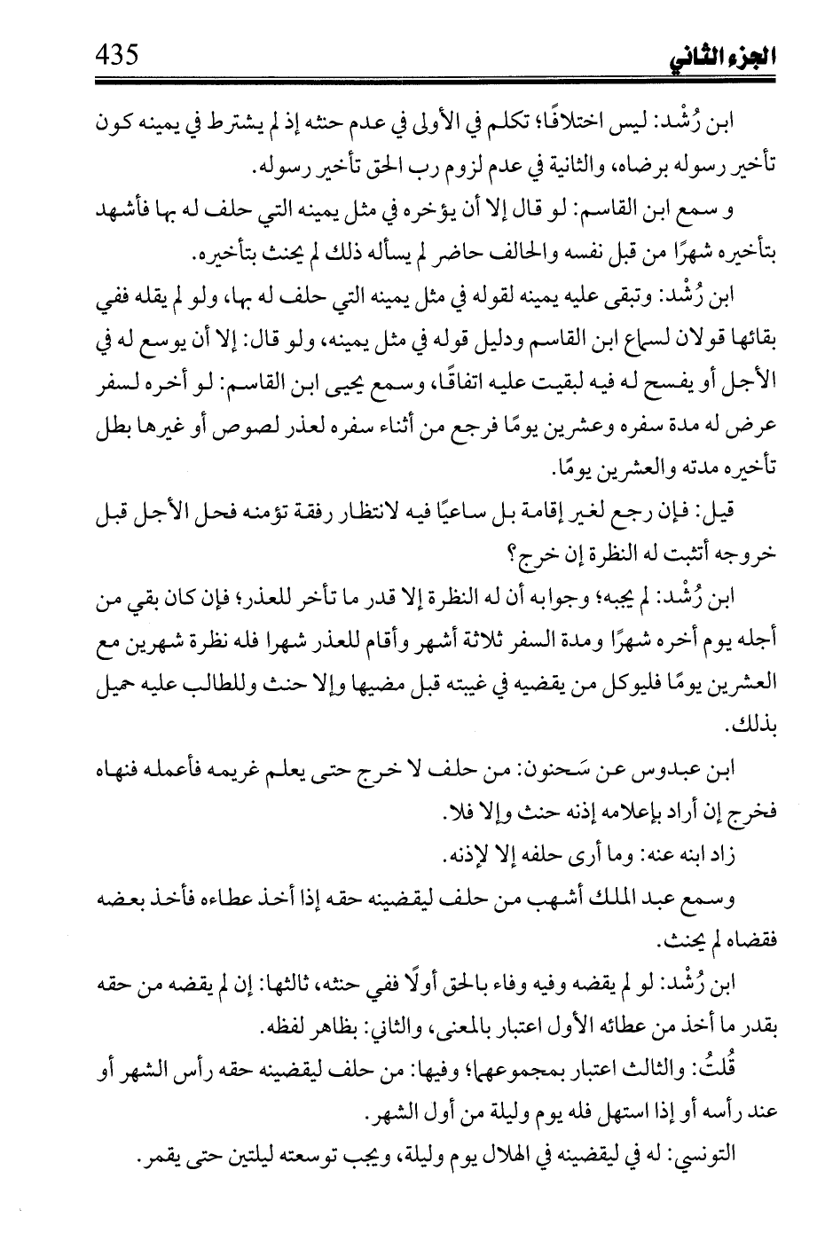 ابن رشد: لم يجبه؛ وجوابه أن له النظرة إلا قدر ما تأخر للعذر؛ فإن كان بقي من أجله يوم وأخره شهراً ومدة السفر ثلاثة أشهر وأقام للعذر شهرا فله نظرة شهرين مع العشرين يوماً فليوكل من يقضيه في غيبته قبل مضيها وإلا حنث وللطالب عليه حميل بذلك.