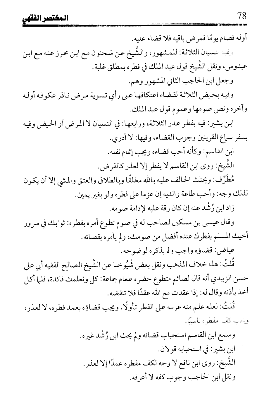 ابن بشير: فيه بفطر عذر الثلاثة، ورابعها: في النسيان لا المرض أو الحيض وفيه بسفر سماع القرينين وجوب القضاء، وفيها: لا أدري.