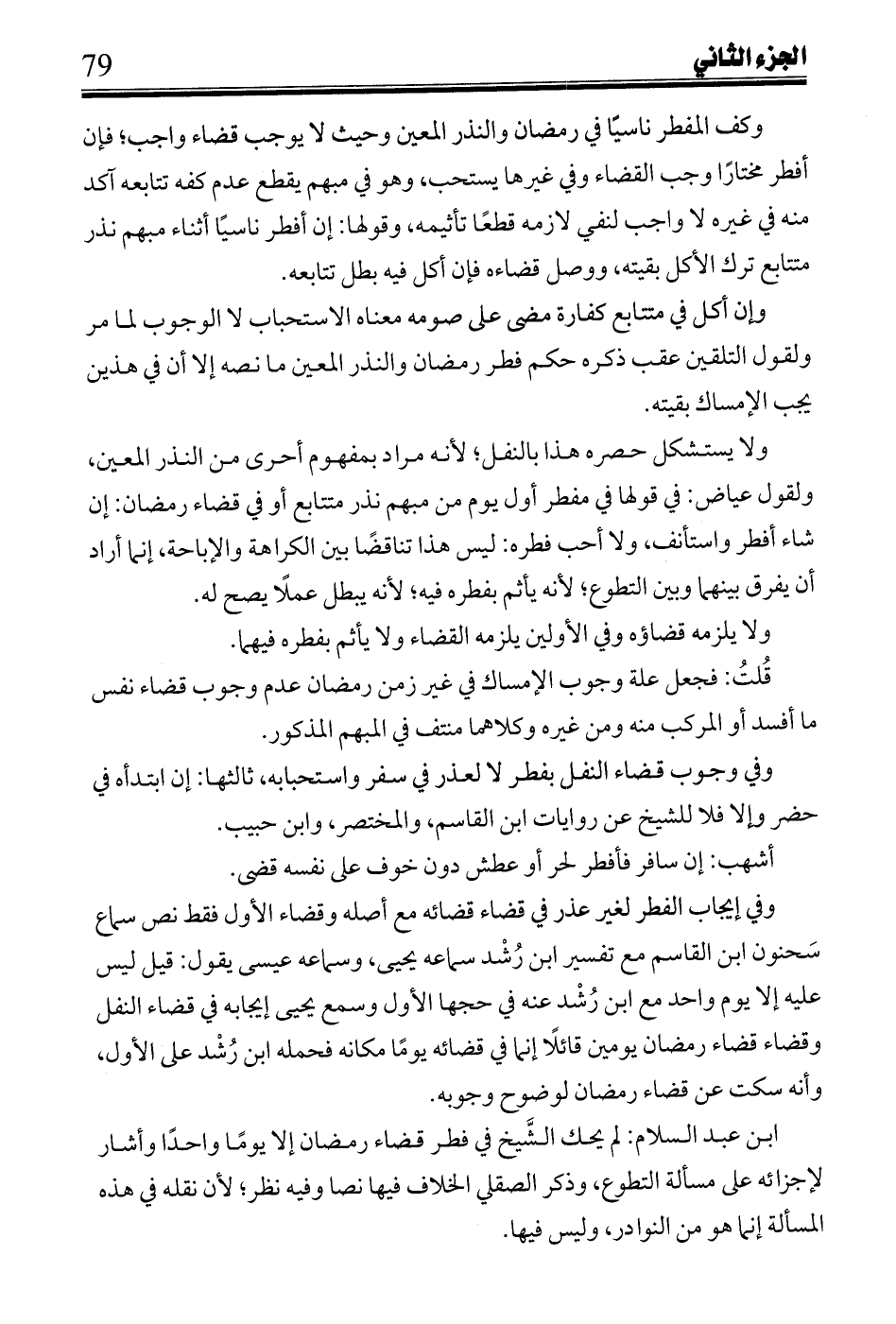 وكف المفطر ناسياً في رمضان والنذر المعين وحيث لا يوجب قضاء واجب؛ فإن أفطر مختاراً وجب القضاء وفي غيرها يستحب، وهو في مبهم يقطع عدم كفه تتابعه آكد منه في غيره لا واجب لنفي لازمه قطعاً تأثيمه، وقولها: إن أفطر ناسياً أثناء مبهم نذر متتابع ترك الأكل بقيته، ووصل قضاءه فإن أكل فيه بطل تتابعه.