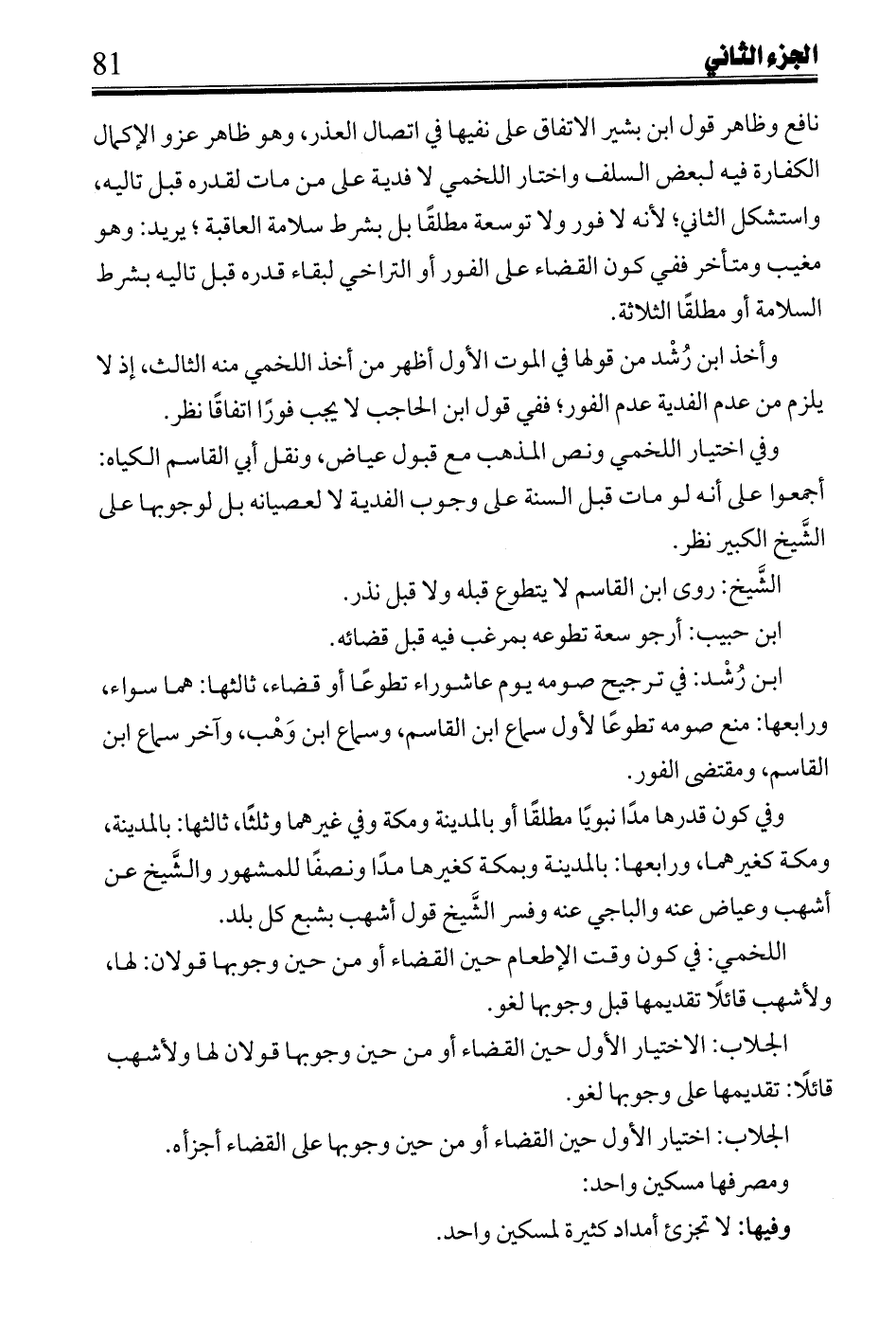 نافع وظاهر قول ابن بشير الاتفاق على نفيها في اتصال العذر، وهو ظاهر عزو الإكمال الكفارة فيه لبعض السلف واختار اللخمي لا فدية على من مات لقدره قبل تاليه، واستشكل الثاني؛ لأنه لا فور ولا توسعة مطلقاً بل بشرط سلامة العاقبة؛ يريد: وهو مغيب ومتأخر ففي كون القضاء على الفور أو التراخي لبقاء قدره قبل تاليه بشرط السلامة أو مطلقاً الثلاثة.
