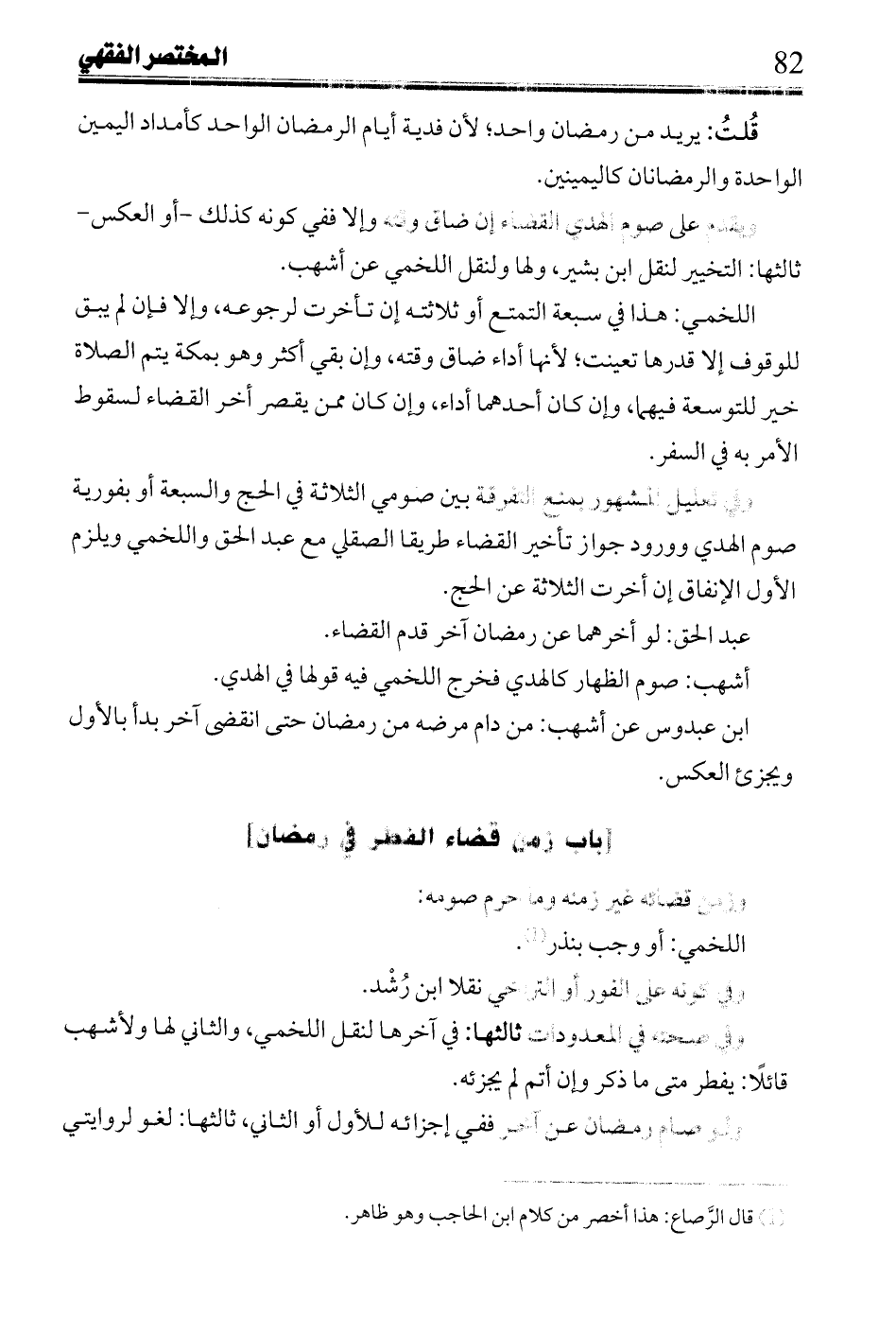 وفي تعليل المشهور بمنع التفرقة بين صومي الثلاثة في الحج والسبعة أو بفورية صوم الهدي وورود جواز تأخير القضاء طريقاً الصقلي مع عبد الحق واللخمي ويلزم الأول الإنفاق إن أخرت الثلاثة عن الحج.