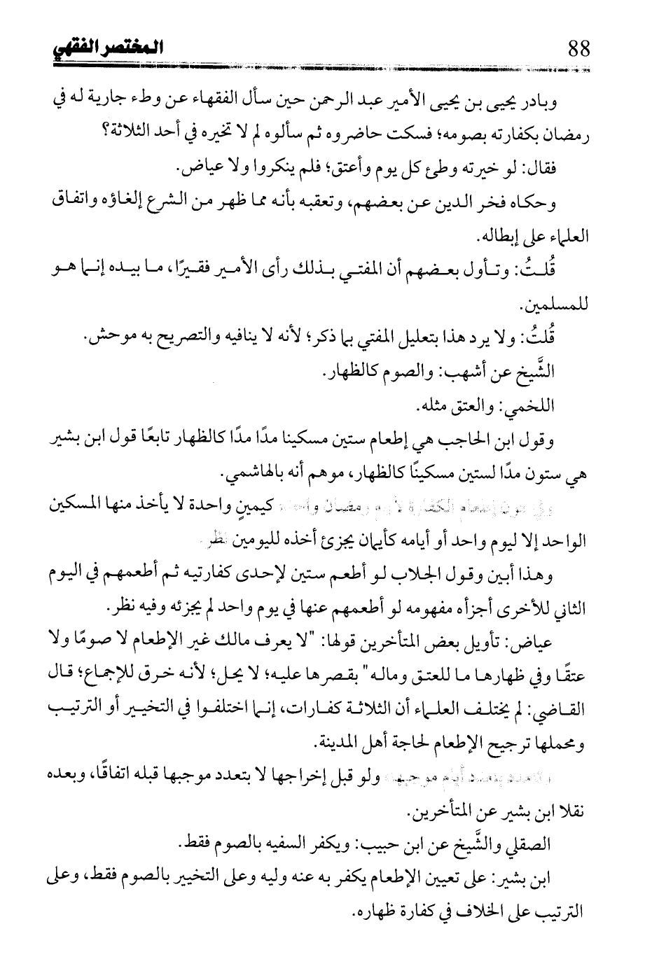 وبادر يحيى بن يحيى الأمير عبد الرحمن حين سأل الفقهاء عن وطء جارية له في رمضان بكفارته بصومه؛ فسكت حاضروه ثم سألوه لم لا تخيره في أحد الثلاثة؟