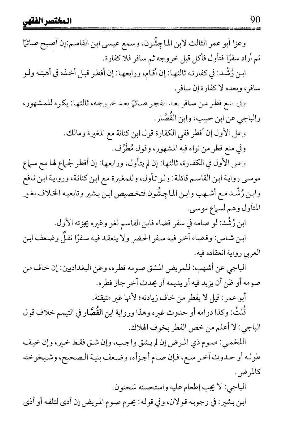 وفي منع فطر من سافر بعد الفجر صائمًا بعد خروجه، ثالثها: يكره للمشهور، والباجي عن ابن حبيب، وابن القُصَّار.