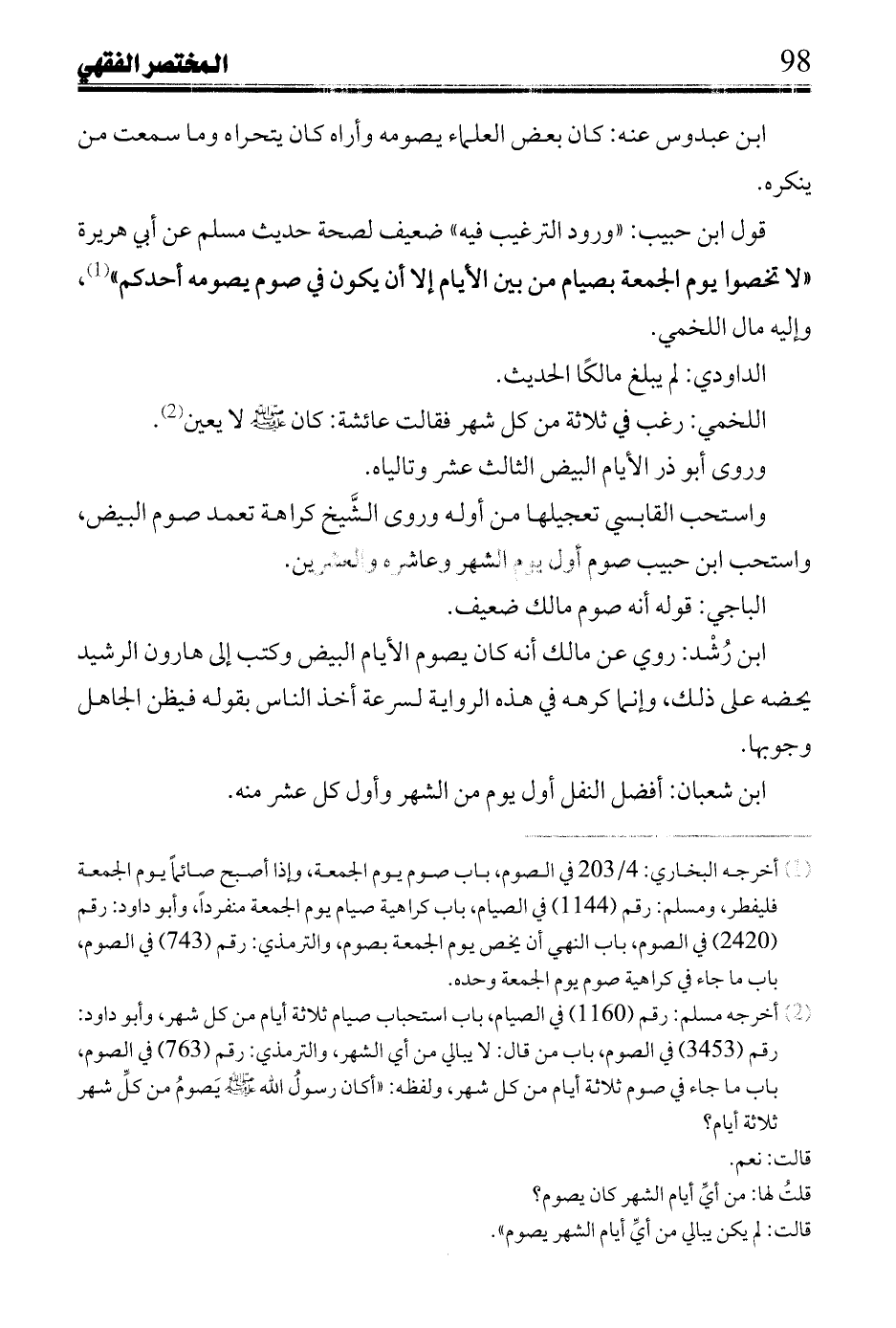 ابن رشد: روي عن مالك أنه كان يصوم الأيام البيض وكتب إلى هارون الرشيد يحضه على ذلك, وإنما كرهه في هذه الرواية لسرعة أخذ الناس بقوله فيظن الجاهل وجوبها.