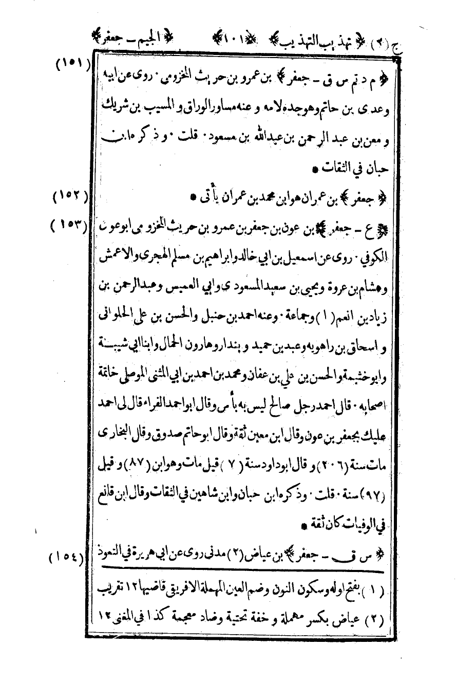 151- "م د تم س ق – جعفر" بن عمرو بن حريث المخزومي روى عن أبيه وعدي بن حاتم وهو جده لأمه وعنه مساور الوراق والمسيب بن شريك ومعن بن عبد الرحمن بن عبد الله بن مسعود قلت وذكره بن حبان في الثقات.