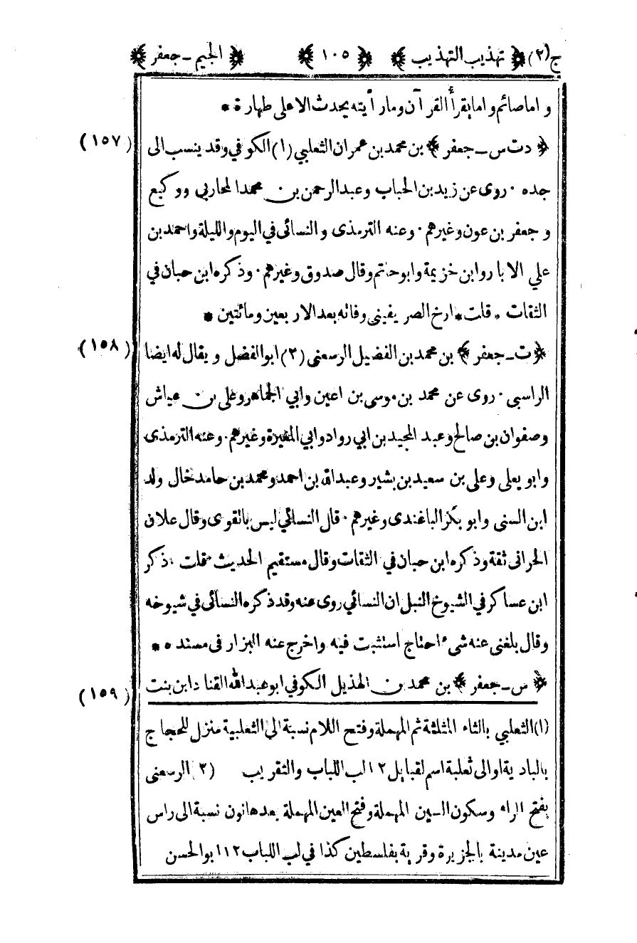 157- "د ت س – جعفر" بن محمد بن عمران الثعلبي1 الكوفي وقد ينسب إلى جده روى عن زيد بن الحباب وعبد الرحمن بن محمد المحاربي ووكيع وجعفر بن عون وغيرهم وعنه الترمذي والنسائي في اليوم والليلة وأحمد بن علي الأبار وابن خزيمة وأبو حاتم وقال صدوق وغيرهم وذكره بن حبان في الثقات قلت أرخ الصريفيني وفاته بعد الأربعين ومائتين.