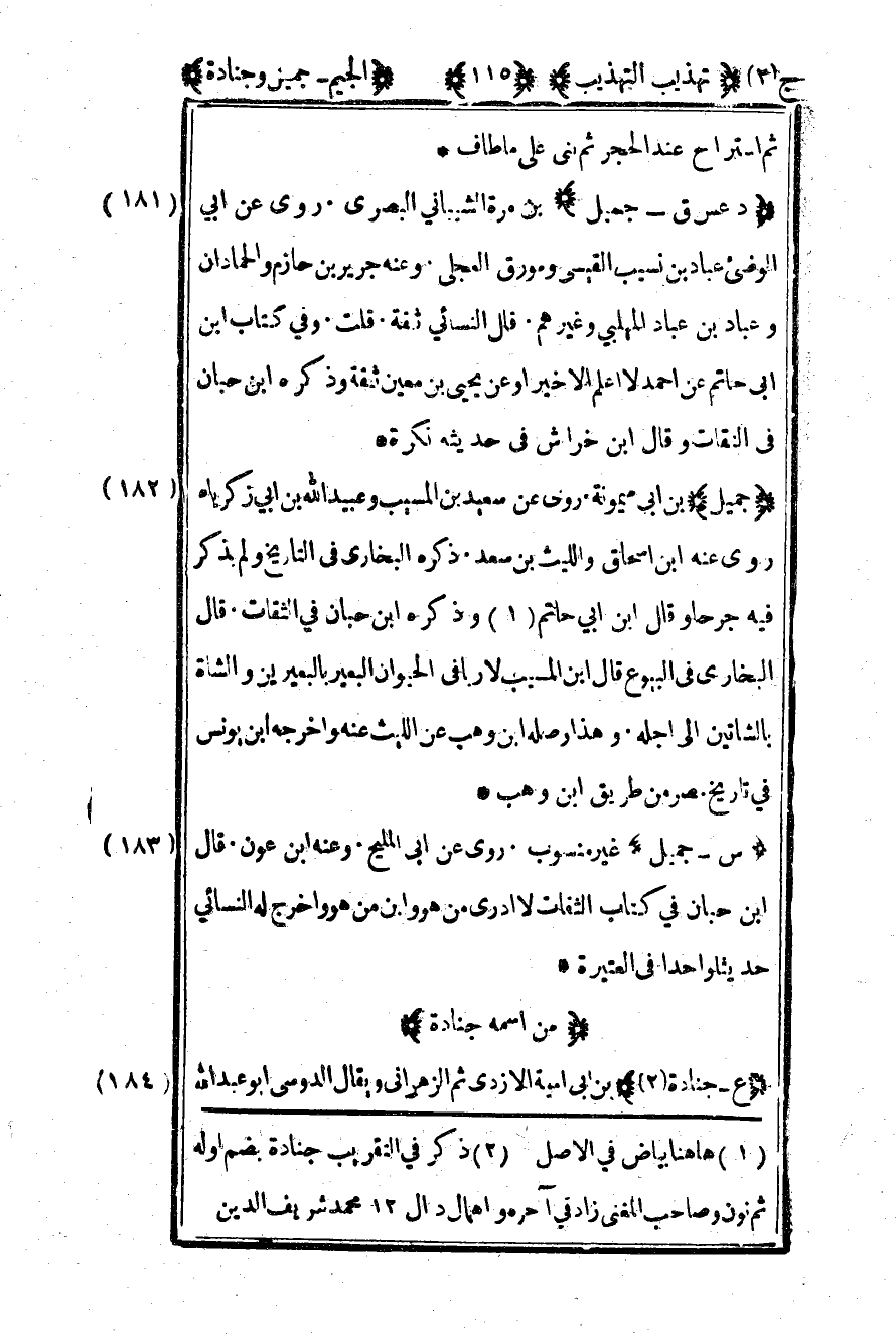 1 ذكر في التقريب جنادة بضم أوله ثم نون وصاحب المغني في آخره واهمال دال "12" محمد شريف الدين.