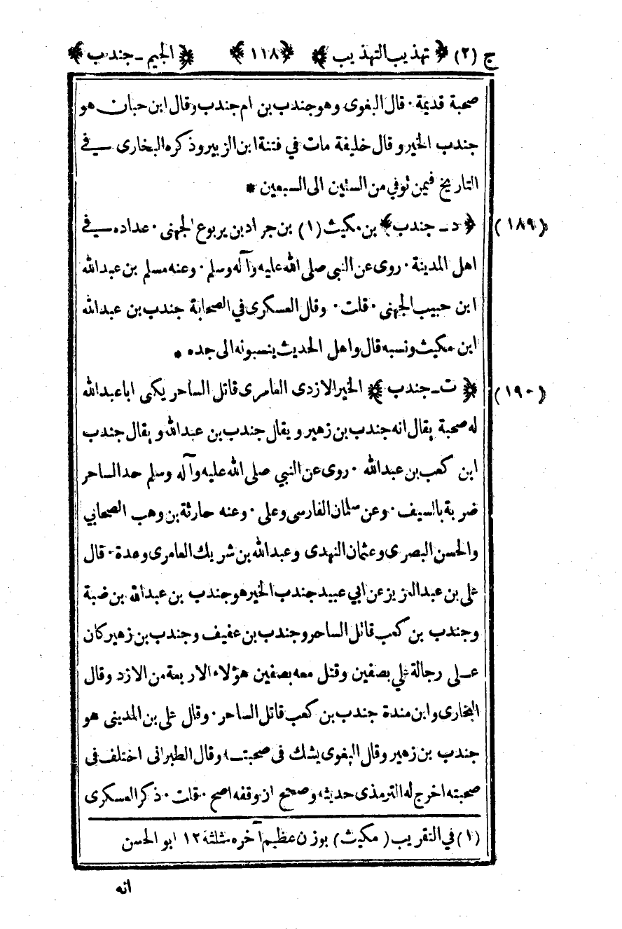 190- "ت – جندب" الخير الأزدي العامري قاتل الساحر يكنى أبا عبد الله له صحبة يقال أنه جندب بن زهير ويقال جندب بن عبد الله ويقال جندب بن كعب بن عبد الله روى عن النبي صلى الله عليه وسلم: "حد الساحر ضربة بالسيف" وعن سلمان الفارسي وعلي وعنه حارثة بن وهب الصحابي والحسن البصري وعثمان النهدي وعبد الله بن شريك العامري وعدة قال علي بن عبد العزيز عن أبي عبيد جندب الخير هو جندب بن عبد الله بن ضبة وجندب بن كعب قاتل الساحر وجندب بن عفيف وجندب بن زهير كان على رجالة علي بصفين وقتل معه بصفين هؤلاء الأربعة من الأزد وقال البخاري وابن مندة جندب بن كعب قاتل الساحر وقال علي بن المديني هو جندب بن زهير وقال البغوي يشك في صحبته وقال الطبراني اختلف في صحبته أخرج له الترمذي حديثه وصحح أن وقفه أصح قلت ذكر العسكري