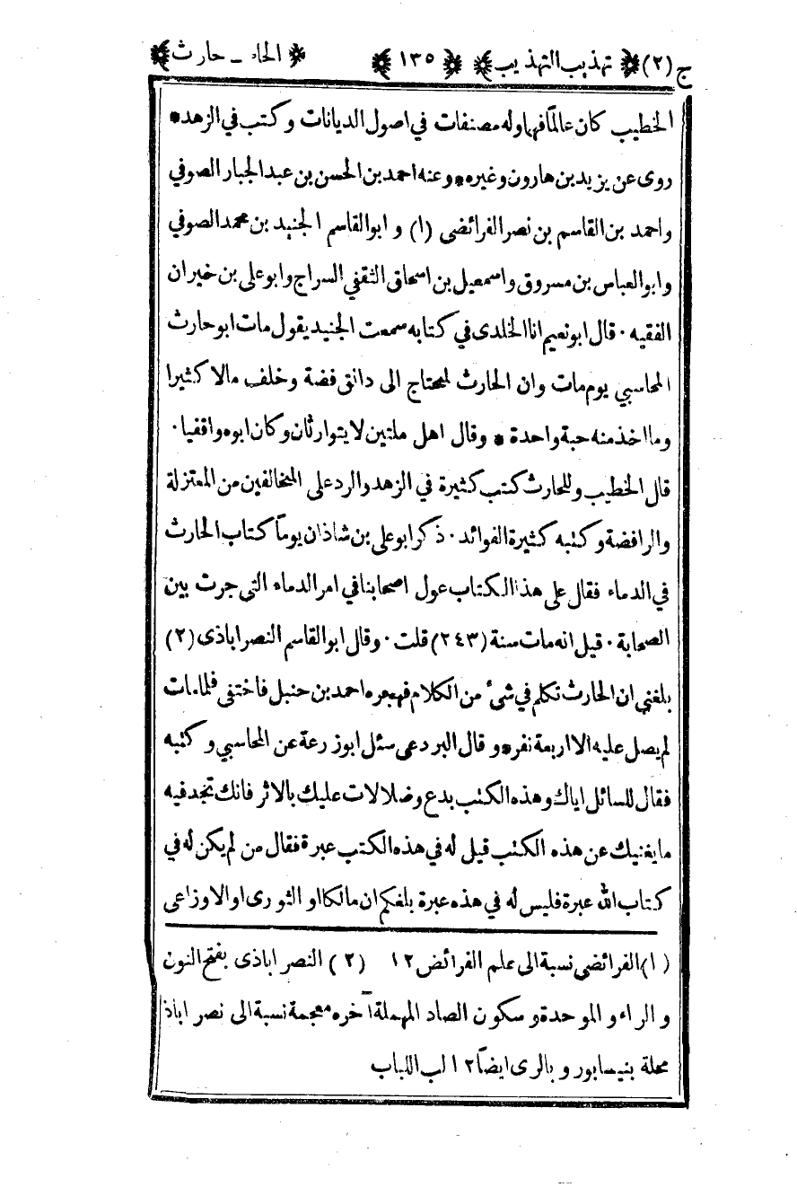 الخطيب كان عالما فهما وله مصنفات في أصول الديانات وكتب في الزهد روى عن يزيد بن هارون وغيره وعنه أحمد بن الحسن بن عبد الجبار الصوفي وأحمد بن القاسم بن نصر الفرائضي1 وأبو القاسم الجنيد بن محمد الصوفي وأبو العباس بن مسروق وإسماعيل بن إسحاق الثقفي السراج وأبو علي بن خيران الفقيه قال أبو نعيم أنا الخلدي في كتابه سمعت الجنيد يقول مات أبو حارث المحاسبي يوم مات وأن الحارث لمحتاج إلى دانق فضة وخلف مالا كثيرا وما أخذ منه حبة واحدة وقال أهل ملتين لا يتوارثان وكان أبوه واقفيا قال الخطيب وللحارث كتب كثيرة في الزهد والرد على المخالفين من المعتزلة والرافضة وكتب كثيرة من الفوائد ذكر أبو علي بن شاذان يوما كتاب الحارث في الدماء فقال على هذا الكتاب عول أصحابنا في أمر الدماء التي جرت بين الصحابة قيل أنه مات سنة "243" قلت وقال أبو القاسم النصر اباذي2 بلغني أن الحارث تكلم في شيء من الكلام فهجره أحمد بن حنبل فاختفى فلما مات لم يصل عليه إلا أربعة نفر وقال البردعي سئل أبو زرعة عن المحاسبي وكتبه فقال للسائل إياك وهذه الكتب بدع وضلالات عليك بالأثر فإنك تجد فيه ما يغنيك عن هذه الكتب قيل له في هذه الكتب عبرة فقال من لم يكن له في كتاب الله عبرة فليس له في هذه عبرة بلغكم أن مالكا أو الثوري أو الأوزاعي