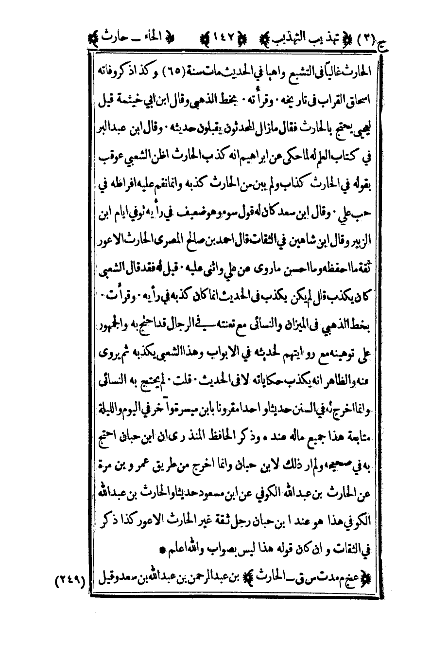 الحارث غاليا في التشيع واهيا في الحديث مات سنة "65" وكذا ذكر وفاته إسحاق القراب في تاريخه وقرأته بخط الذهبي وقال بن أبي خيثمة قيل ليحيى يحتج بالحارث فقال ما زال المحدثون يقبلون حديثه وقال بن عبد البر في كتاب العلم له لما حكى عن إبراهيم أنه كذب الحارث أظن الشعبي عوقب بقوله في الحارث كذاب ولم يبن من الحارث كذبه وإنما نقم عليه افراطه في حب علي وقال بن سعد كان له قول سوء وهو ضعيف في رأيه توفي أيام بن الزبير وقال بن شاهين في الثقات قال أحمد بن صالح المصري الحارث الأعور ثقة ما أحفظه وما أحسن ما روى عن علي وأثنى عليه قيل له فقد قال الشعبي كان يكذب قال لم يكن يكذب في الحديث إنما كان كذبه في رأيه وقرأت بخط الذهبي في الميزان والنسائي مع تعنته في الرجال قد احتج به والجمهور على توهينه مع روايتهم لحديثه في الأبواب وهذا الشعبي يكذبه ثم يروي عنه والظاهر أنه يكذب حكاياته لا في الحديث قلت لم يحتج به النسائي وإنما أخرج له في السنن حديثا واحدا مقرونا بابن ميسرة وآخر في اليوم والليلة متابعة هذا جميع ما له عنده وذكر الحافظ المنذري أن بن حبان احتج في صحيحه ولم أر ذلك لابن حبان وإنما أخرج من طريق عمرو بن مرة عن الحارث بن عبد الله الكوفي عن بن مسعود حديثا والحارث بن عبد الله الكوفي هذا هو عند بن حبان رجل ثقة غير الحارث الأعور كذا ذكر في الثقات وأن كان قوله هذا ليس بصواب والله أعلم.