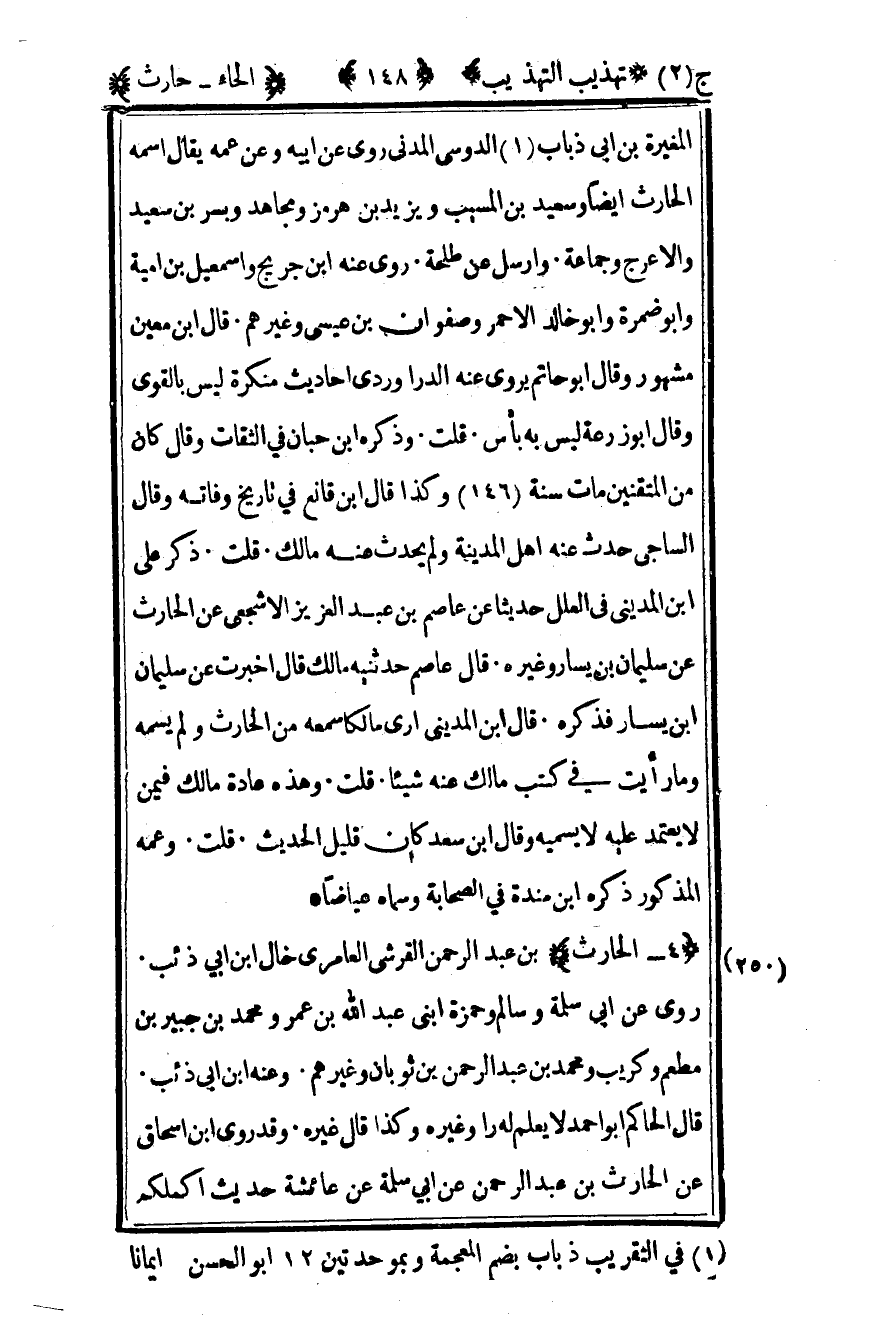 250- "4 – الحارث" بن عبد الرحمن القرشي العامري خال بن أبي ذئب روى عن أبي سلمة وسالم وحمزة ابني عبد الله بن عمر ومحمد بن جبير بن مطعم وكريب ومحمد بن عبد الرحمن بن ثوبان وغيرهم وعنه بن أبي ذئب قال الحاكم أبو أحمد لا يعلم له راو غيره وكذا قال غيره وقد روى بن إسحاق عن الحارث بن عبد الرحمن عن أبي سلمة عن عائشة حديث: "أكملكم
