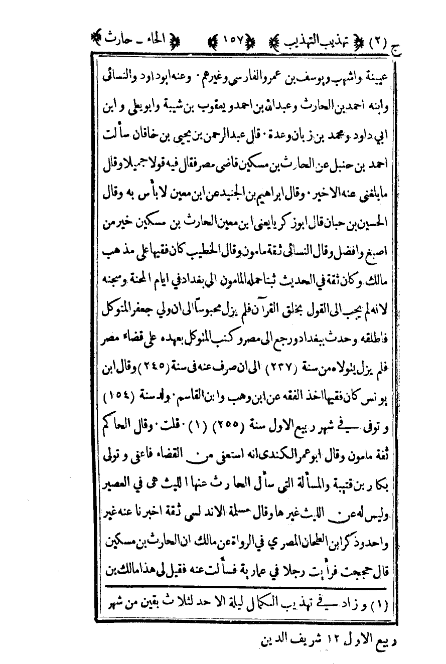 عيينة وأشهب ويوسف بن عمر والفارسي وغيرهم وعنه أبو داود والنسائي وابنه أحمد بن الحارث وعبد الله بن أحمد ويعقوب بن شيبة وأبو يعلى وابن أبي داود ومحمد بن زبان وعدة قال عبد الرحمن بن يحيى بن خاقان سألت أحمد بن حنبل عن الحارث بن مسكين قاضي مصر فقال فيه قولا جميلا وقال ما بلغني عنه الأخير وقال إبراهيم بن الجنيد عن بن معين لا بأس به وقال الحسين بن حبان قال أبو زكريا يعني بن معين الحارث بن مسكين خير من أصبغ وأفضل وقال النسائي ثقة مأمون وقال الخطيب كان فقيها على مذهب مالك وكان ثقة في الحديث ثبتا حمله المأمون إلى بغداد في أيام المحنة وسجنه لأنه لم يجب إلى القول بخلق القرآن فلم يزل محبوسا إلى أن ولي جعفر المتوكل فاطلقه وحدث ببغداد ورجع إلى مصر وكتب المتوكل بعهده على قضاء مصر فلم يزل يتولاه من سنة "237" إلى أن صرف عنه في سنة "245" وقال بن يونس كان فقيها أخذ الفقه عن بن وهب وابن القاسم ولد سنة 154 وتوفي في شهر ربيع الأول سنة "255"1. قلت: وقال الحاكم ثقة مأمون وقال أبو عمر الكندي أنه استعفي من القضاء فأعفي وتولى بكار بن قتيبة والمسألة التي سأل الحارث عنها الليث هي في العصير وليس له عن الليث غيرها وقال مسلمة الأندلسي ثقة أخبرنا عنه غير واحد وذكر بن الطحان المصري في الرواة عن مالك أن الحارث بن مسكين قال حججت فرأيت رجلا في عمارية فسألت عنه فقيل لي هذا مالك بن