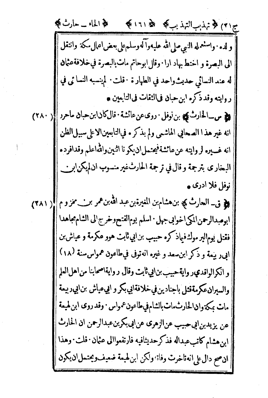 280- "س – الحارث" بن نوفل روى عن عائشة قال كان بن حبان ما حرر أنه غير هذا الصحابي الهاشمي ولم يذكره في التابعين إلا على سبيل الظن أنه غيره لروايته عن عائشة فيحتمل أن يكونا اثنين والله أعلم وقد أفرده البخاري بترجمة وقال في ترجمة الحارث غير منسوب إن لم يكن بن نوفل فلا أدري.