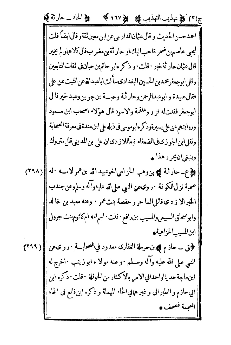 298- "ع – حارثة" بن وهب الخزاعي أخو عبيد الله بن عمر لأمه له صحبة نزل الكوفة روى عن النبي صلى الله عليه وسلم وعن جندب الخير الأزدي قاتل الساحر وحفصة بنت عمر وعنه معبد بن خالد وأبو إسحاق السبيعي والمسيب بن رافع قلت اسم أمة كلثوم بنت جرول بن المسيب الخزاعية.